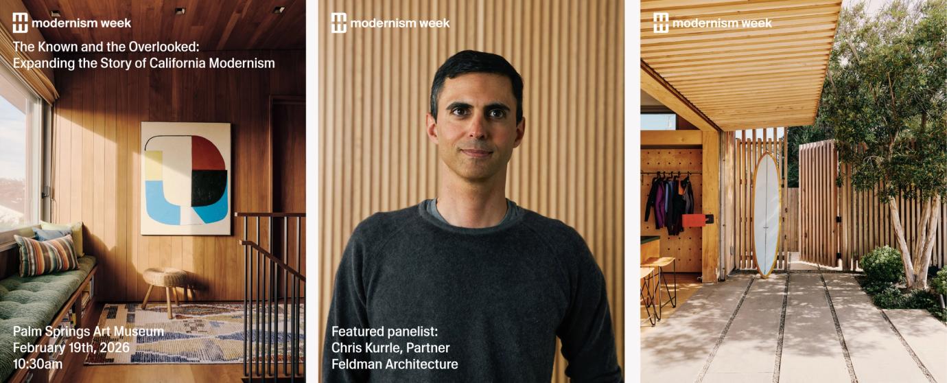 On February 19th, 2026, Partner Chris Kurrle will be speaking at Palm Springs Modernism Week on a panel about the well known and often overlooked trailblazers of the California Modernism movement, and how that legacy is carried on today. He'll reference Surf House as a case study to explore how our work both expands upon and honors the California Modernism movement through site-sensitivity and materiality. He will be joined by Alan Hess, Executive Director and Curator of the Palm Springs Art Museum Christine Vendredi, and the ARCHITECT Editor-in-Chief Paul Makovsky.