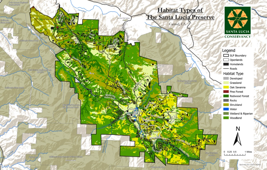 The Santa Lucia Preserve is a private community nestled in the coastal hills between Carmel and Big Sur that spans 20,000 acres, 18,000 of which are protected in perpetuity by the Santa Lucia Conservancy, a nonprofit land trust that works to advocate for the ecological integrity of the protected lands. The remaining 10% of the land is set aside for infrastructure, community amenities, and 297 homesites. The Santa Lucia Conservancy is financially and philosophically sustained by the limited residential community of The Preserve, which occupies the less environmentally sensitive areas.
