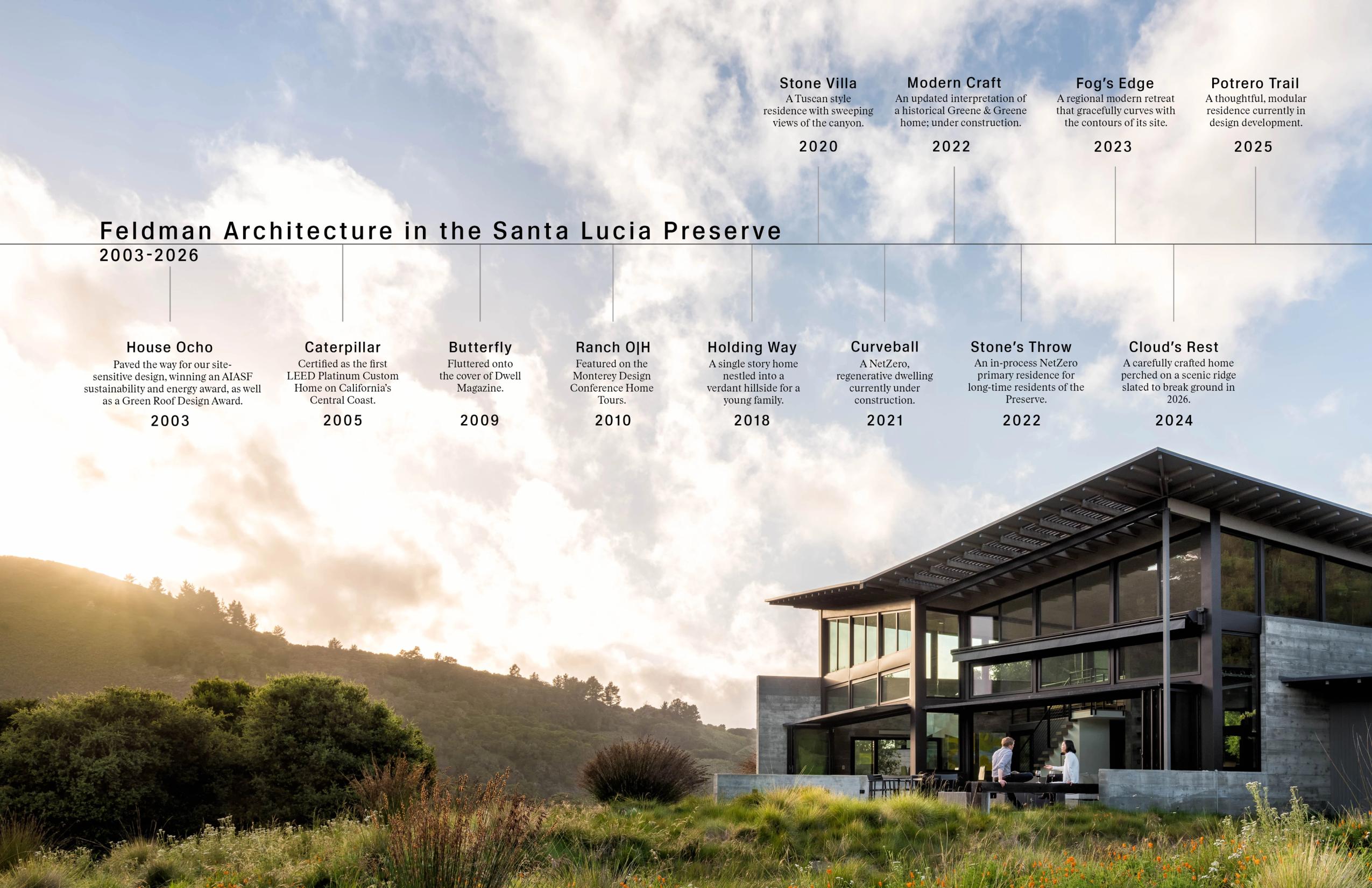 House Ocho, the first Feldman Architecture project, set the tone for our work in The Preserve with a series of environmentally responsive structures, earning an AIASF Sustainability Award, as well as a Green Roof Design Award. With subsequent projects like the rammed-earth Caterpillar House, the first LEED Platinum Custom Home on California’s Central Coast; the water-harvesting Butterfly House, which graced the cover of Dwell Magazine; to Curveball, a NetZero, regenerative dwelling currently under construction; we've deeply enjoyed providing innovative and progressive design solutions to this forward-thinking community. To see more, click on the Communities tag, or explore Modern Craft, Stone's Throw, Ranch O|H, or Stone Villa.