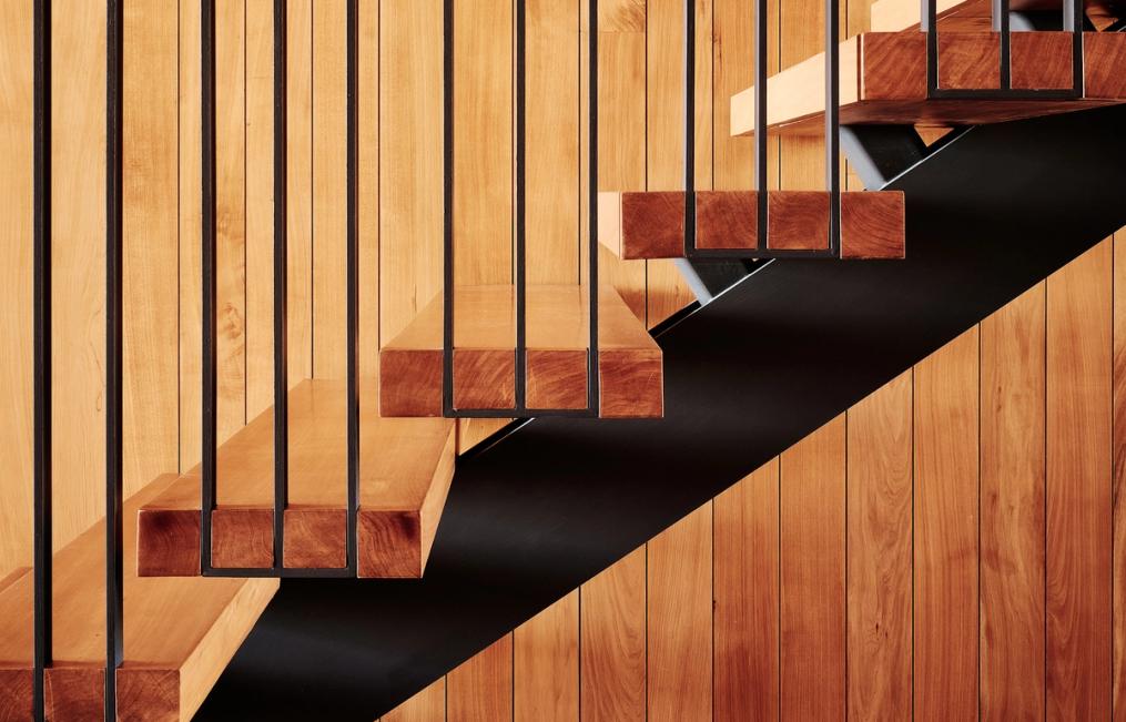 Monterey Cypress, a robust, resilient, regal wood, is accustomed to the site’s coastal California climate and when left unfinished, weathers to a sophisticated grey– the wood also therefore quickly becoming a focal point of the home’s design, both interior and exterior. Monterey Cypress treads, accented by steel, both melt the stair into its surroundings and add material interest.