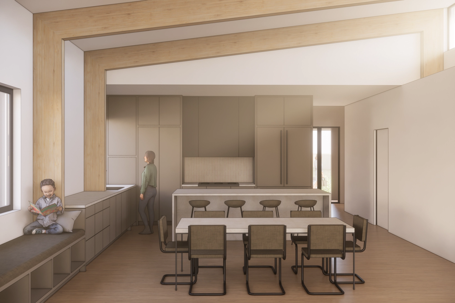 Our proposed solution is a 2,598sqft 3 bedroom, 3 bathroom home composed of structurally insulated panels (SIPs) and mass timber moment frames, all of which are manufactured off-site and delivered ready to construct, minimizing construction time. The exterior palette of cement plaster and fire-rated composite wood siding paired with a standing seam roof are non-combustible and get field-installed once the shell is in place. The modular interior casework provides a variety of simple, functional but elevated design solutions.