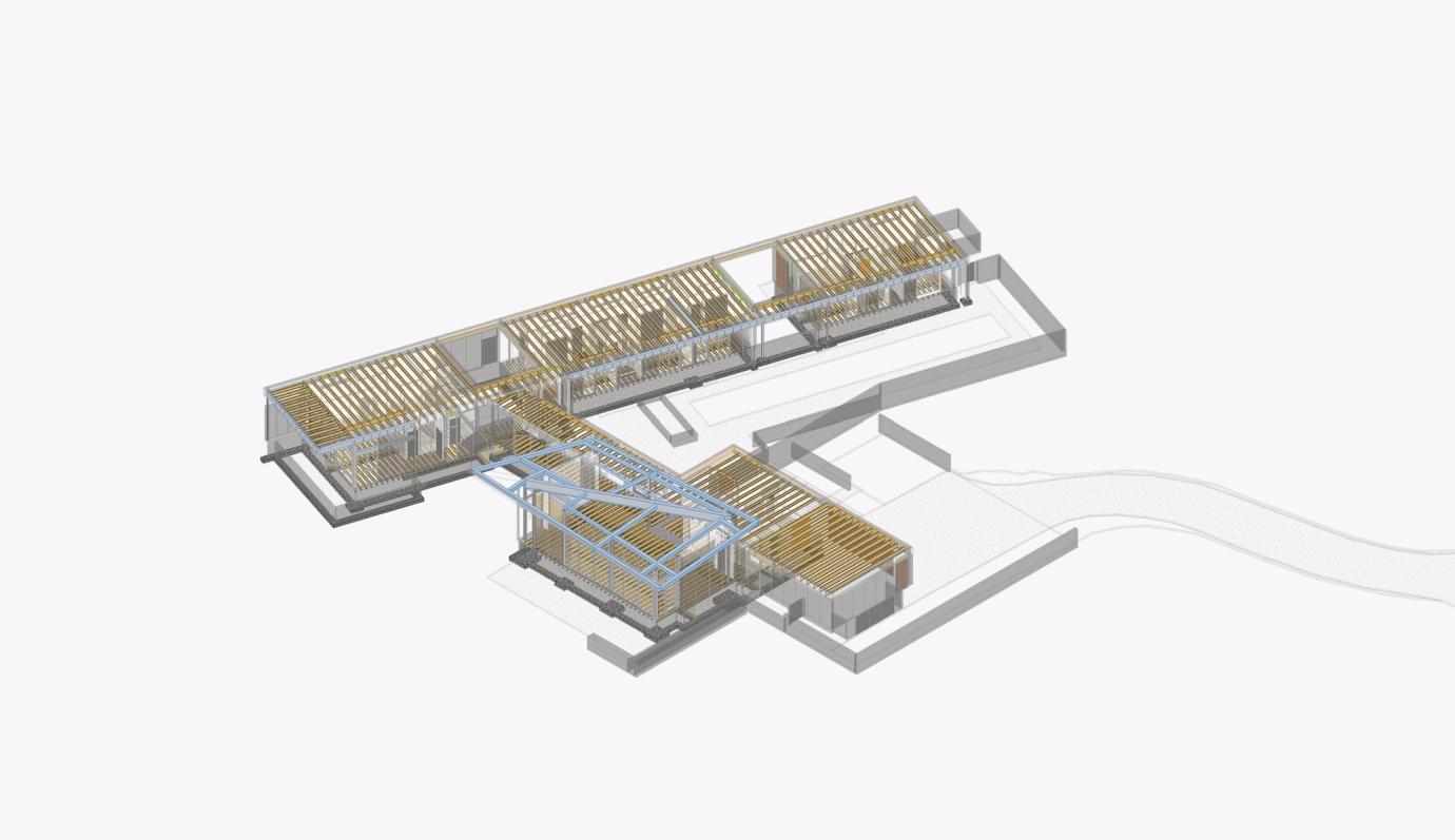 Looking for ample space for their family and two dogs, our clients imagined a home that supports their active lifestyle – specifically accommodating a lap pool and home gym. The responding design reacts delicately to the complex site, shielding occupants from neighbors to the northeast, while opening towards southwestern views as a single-story winged form that elegantly blends into the surrounding forest.