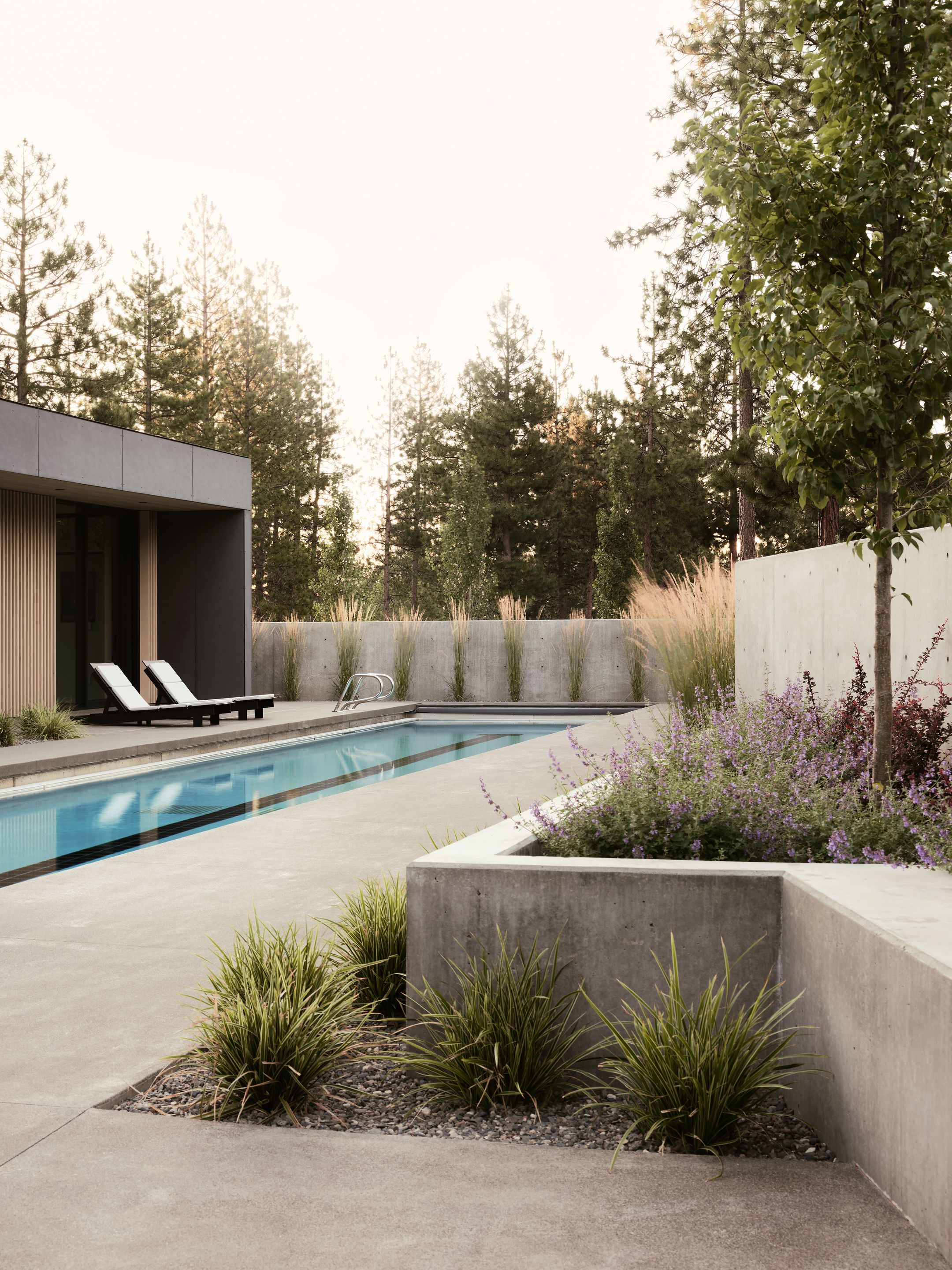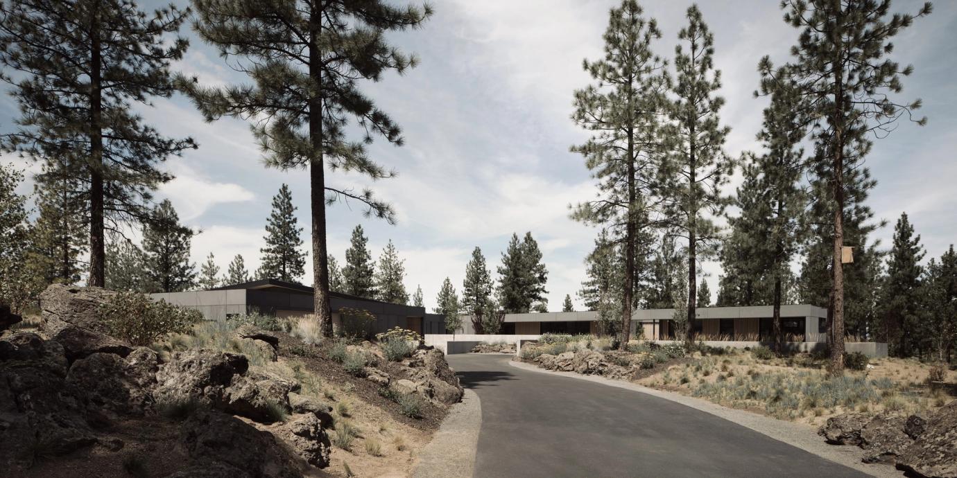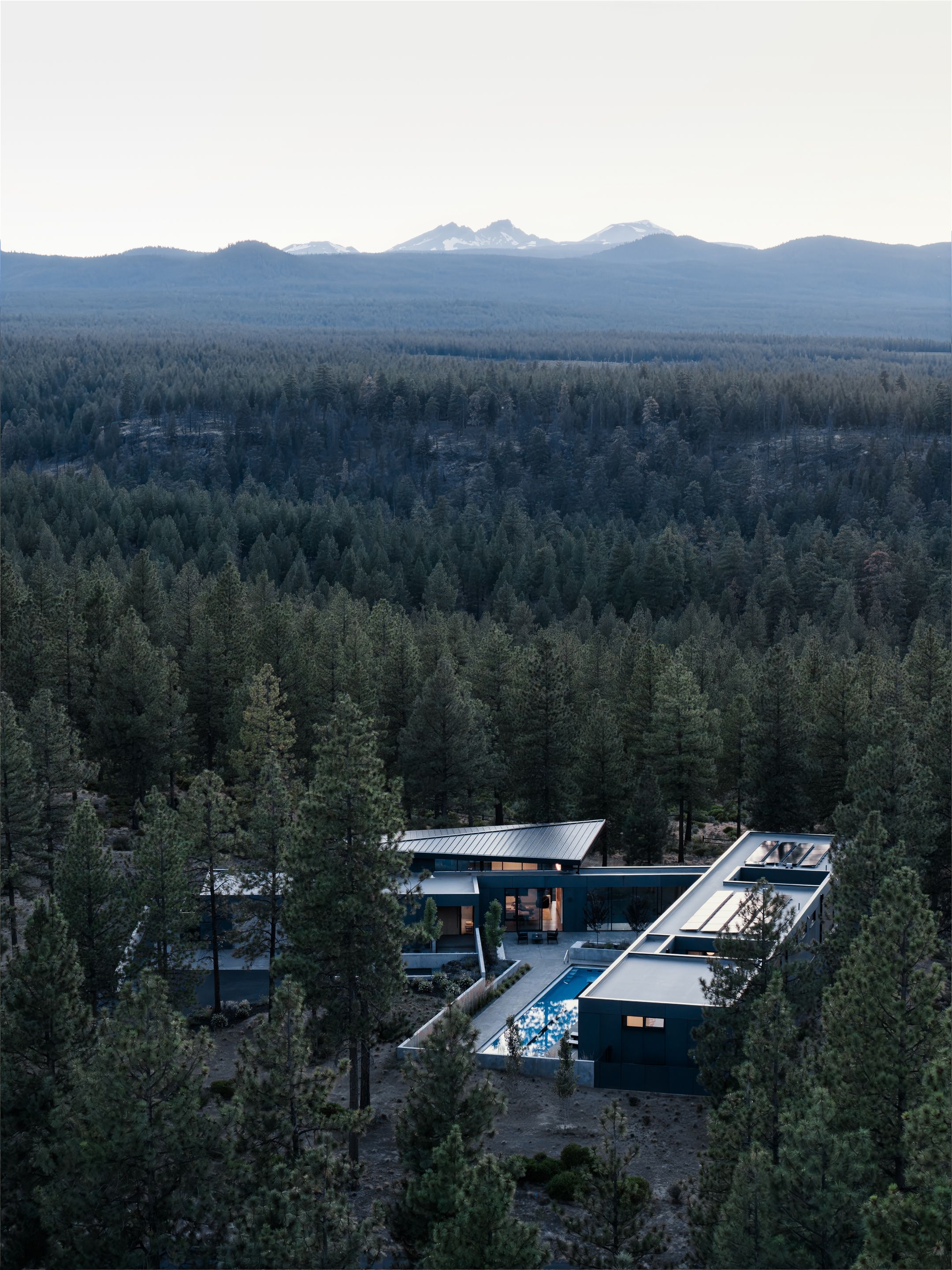 Recent empty nesters looking to relocate from Portland to Bend contacted our team to design an escape fit for their eventual retirement. The home’s private wing stretches to protect an outdoor lap pool and sitting area, acting as a shield from strong winds as well a close by neighboring property. The public wing runs perpendicularly, housing a living, dining, and kitchen area that opens completely onto an outdoor patio and firepit, creating warm outdoor living space for cool Oregon evenings. A protected windowed bridge connects the perpendicular wings, creating a sense of transition and compression between the two forms.