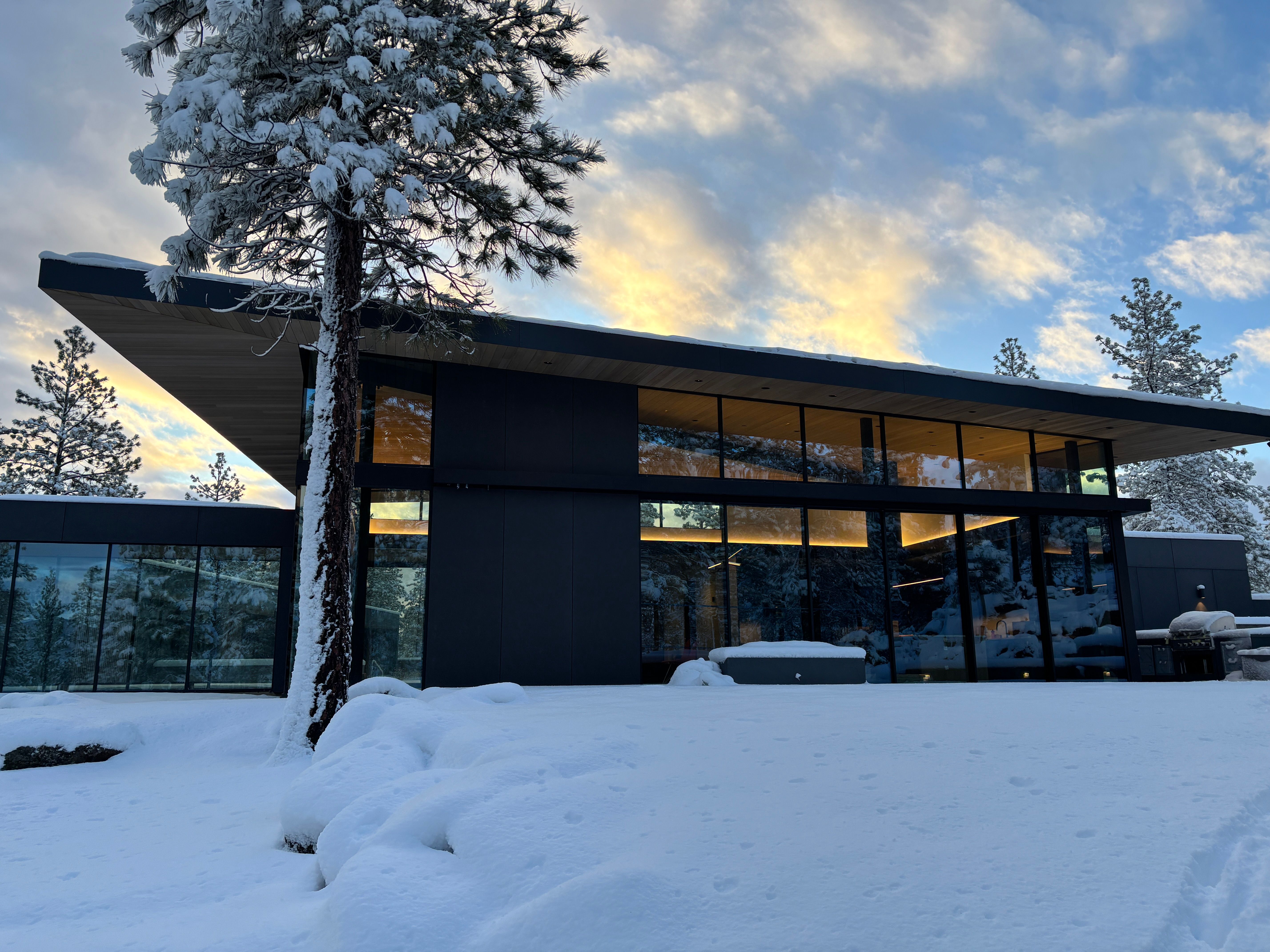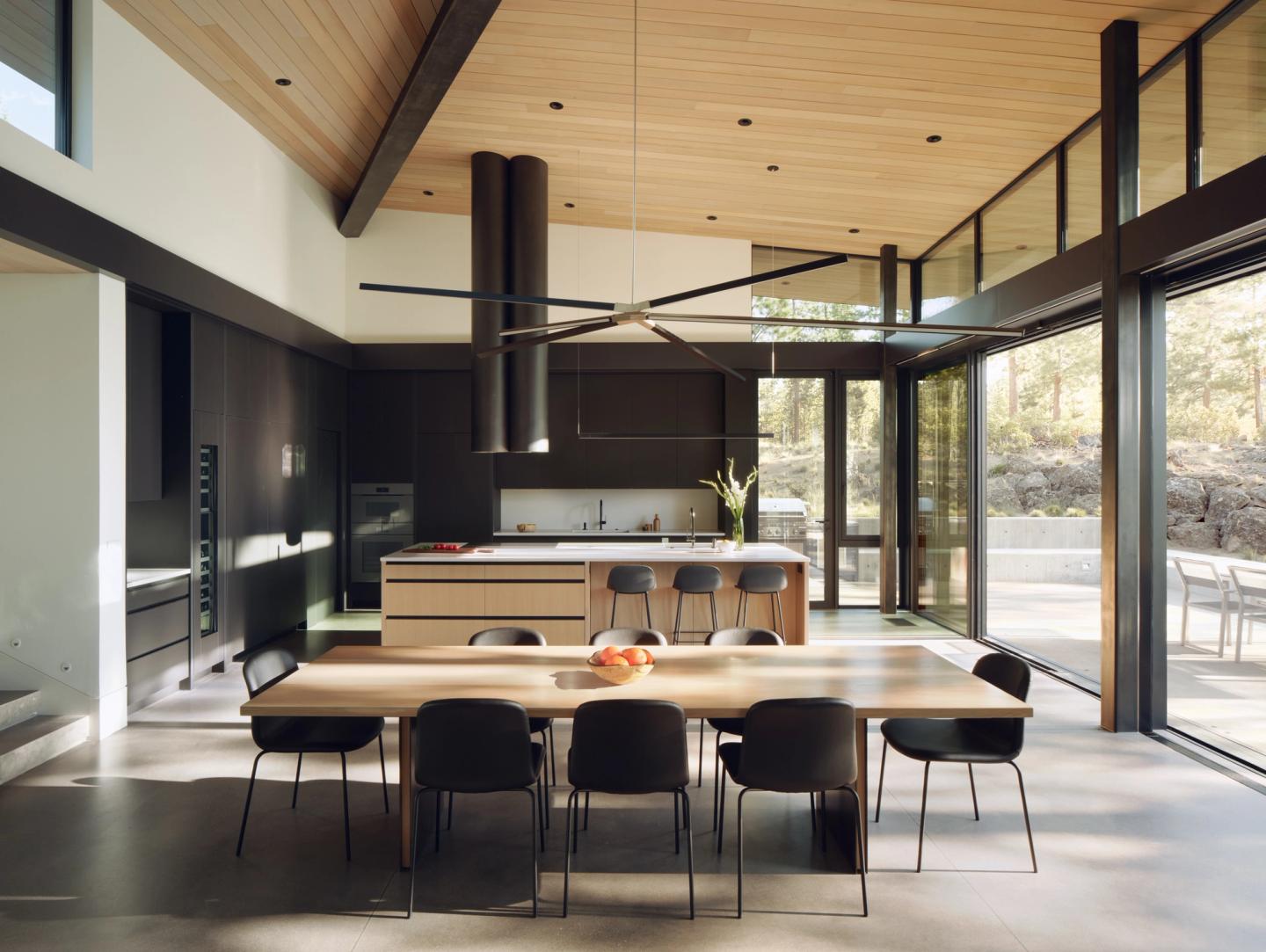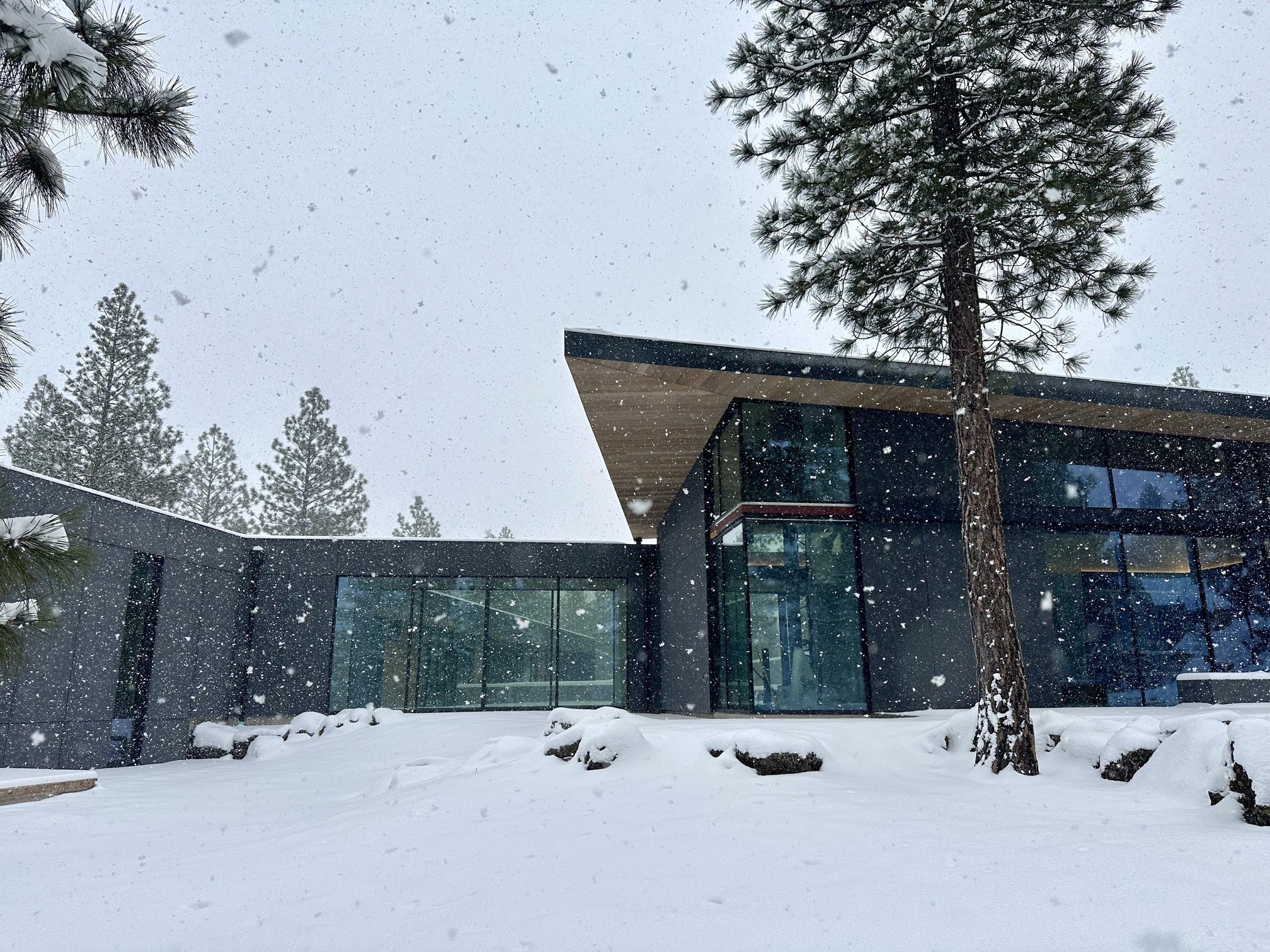 Recent empty nesters looking to relocate from Portland to Bend contacted our team to design an escape fit for their eventual retirement. The home’s private wing stretches to protect an outdoor lap pool and sitting area, acting as a shield from strong winds as well a close by neighboring property. The public wing runs perpendicularly, housing a living, dining, and kitchen area that opens completely onto an outdoor patio and firepit, creating warm outdoor living space for cool Oregon evenings. A protected windowed bridge connects the perpendicular wings, creating a sense of transition and compression between the two forms.