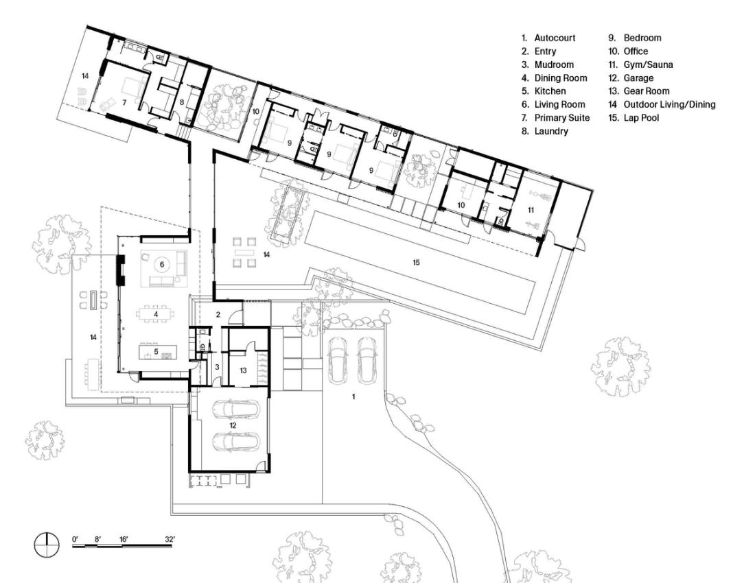 Looking for ample space for their family and two dogs, our clients imagined a home that supports their active lifestyle – specifically accommodating a lap pool and home gym. The responding design reacts delicately to the complex site, shielding occupants from neighbors to the northeast, while opening towards southwestern views as a single-story winged form that elegantly blends into the surrounding forest.