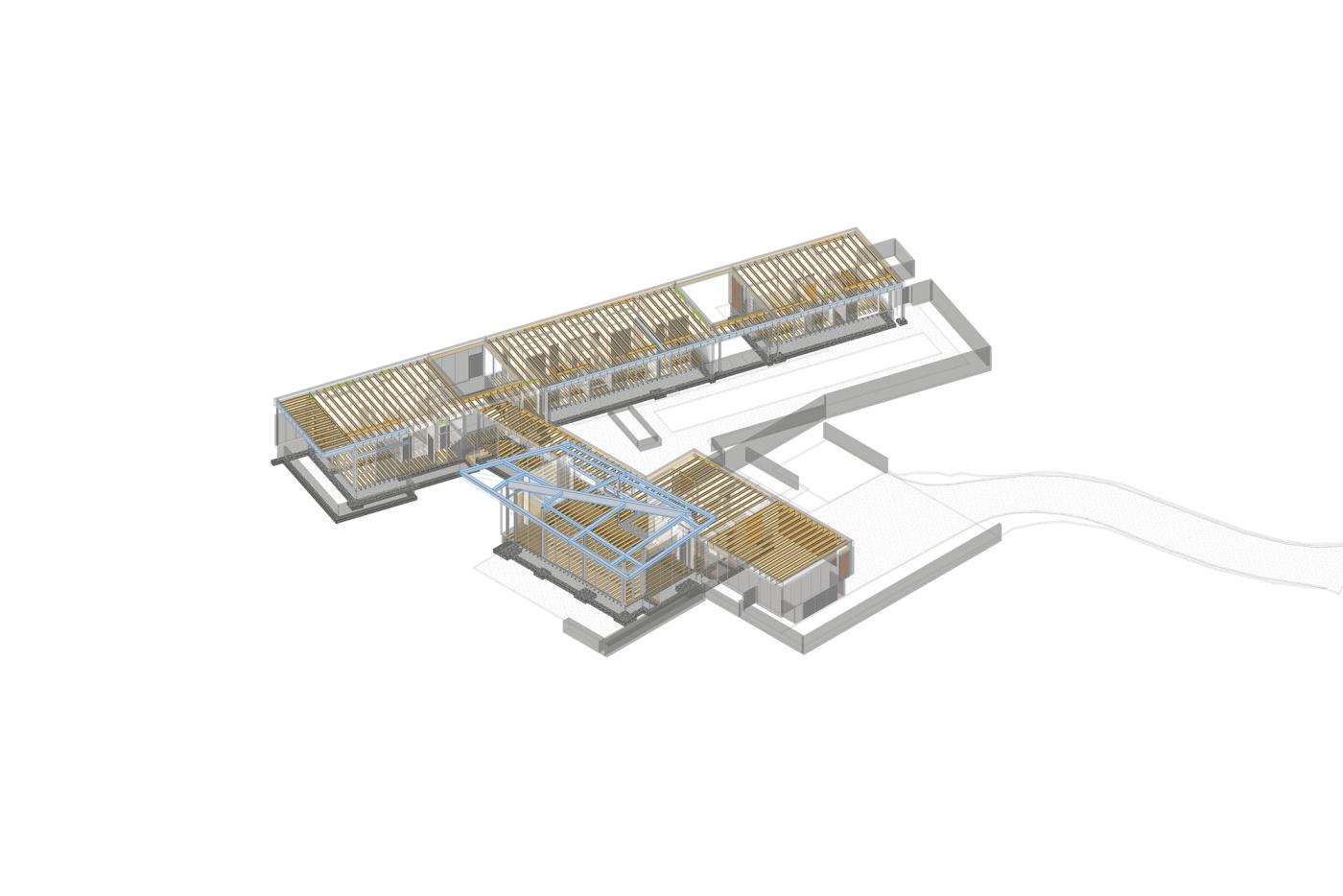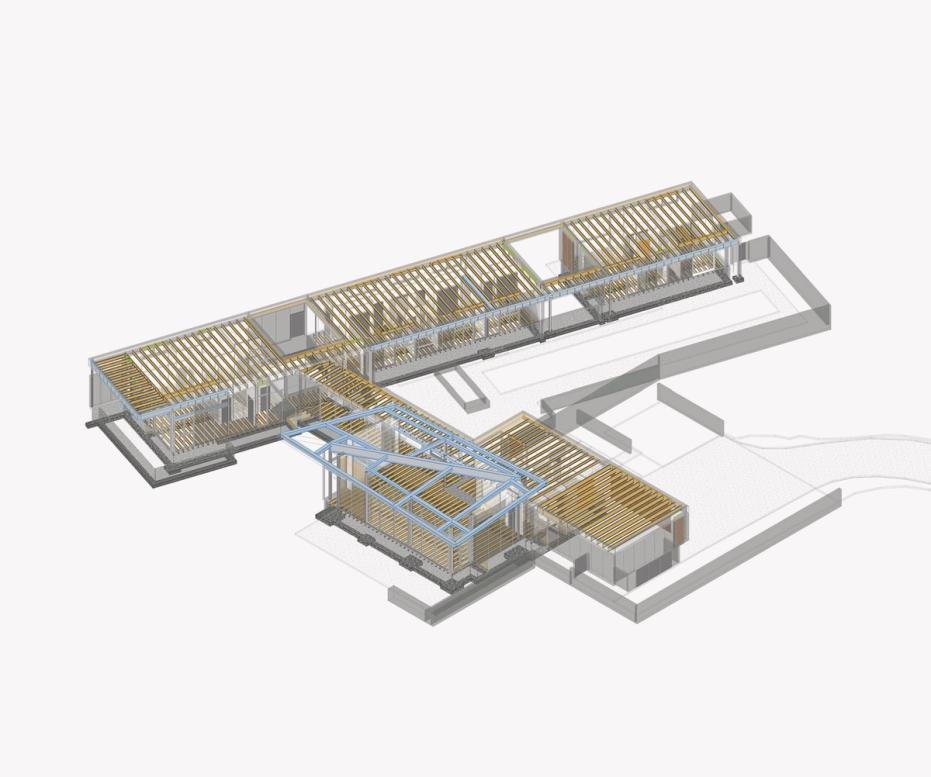 Courtyards tucked into the private wing break up the linear form, inviting light and garden views into the guest bedrooms and offices. In the great room, a dynamic roof form runs diagonally through the space, and clerestory windows dramatically open into the surrounding tree canopy.