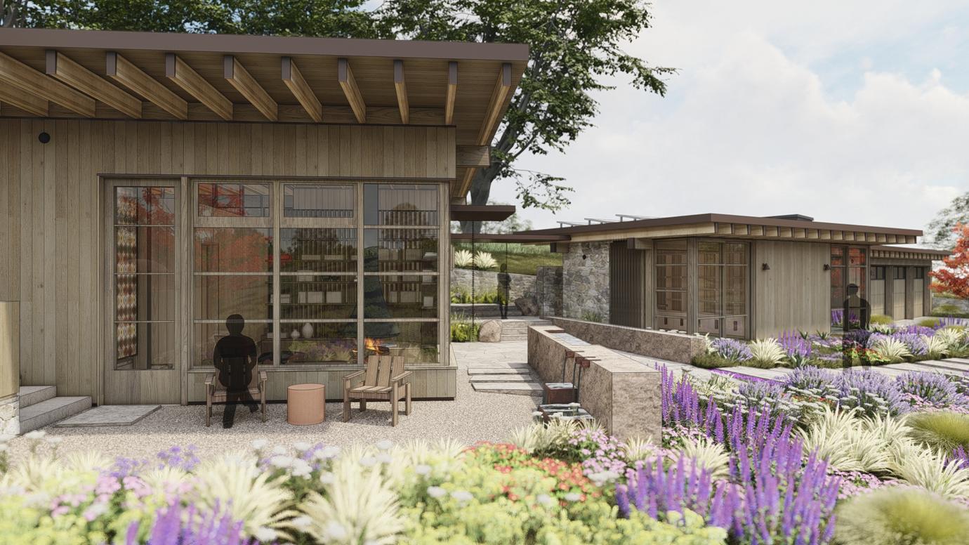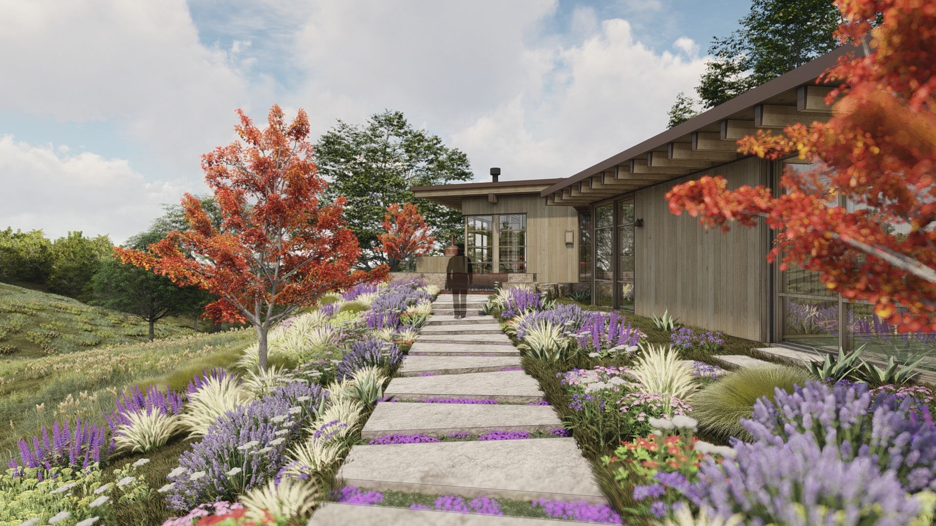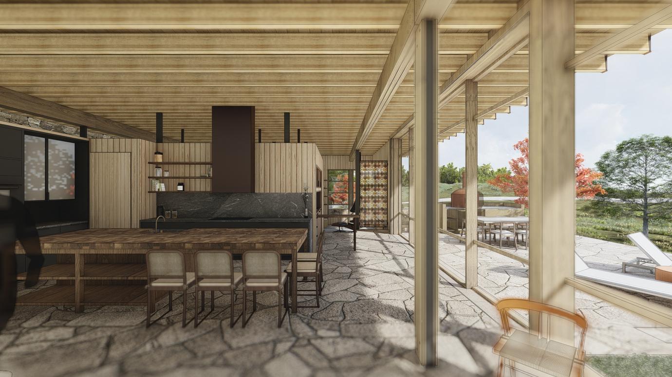 A series of pavilions arch gently towards thoughtfully curated views, providing each living space with a unique connection to the site and natural light. The structure reacts sensitively to the land - maintaining the site's natural slope. Heavy stone walls anchor each outdoor space, gracefully dissolving into landscaping as they curve with the earth.