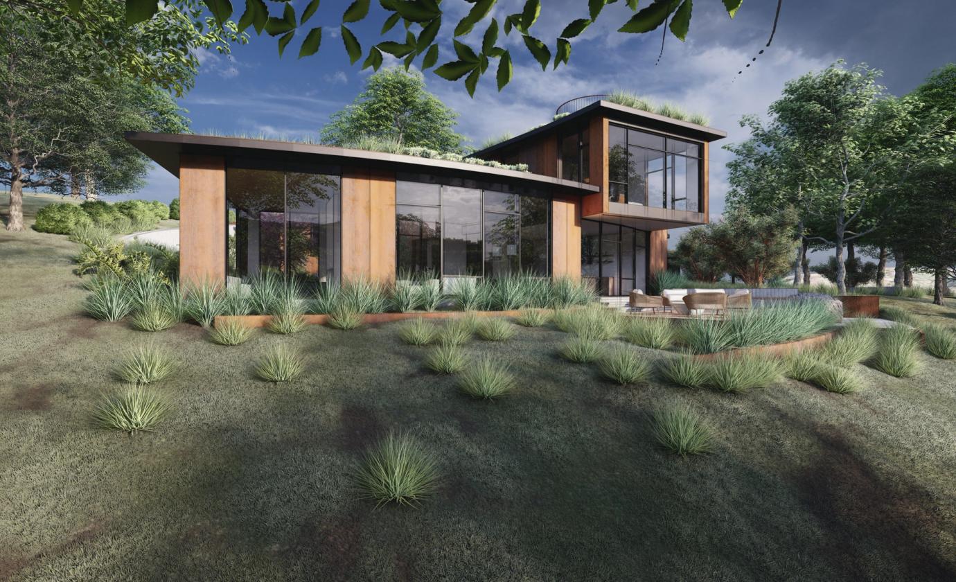 Considering fire resiliency and sustainability, the building is enveloped by durable, low-maintenance modular weathering steel panels and aluminum windows. The eroded material aesthetic reinforces the conceptual merging of architecture and landscape.