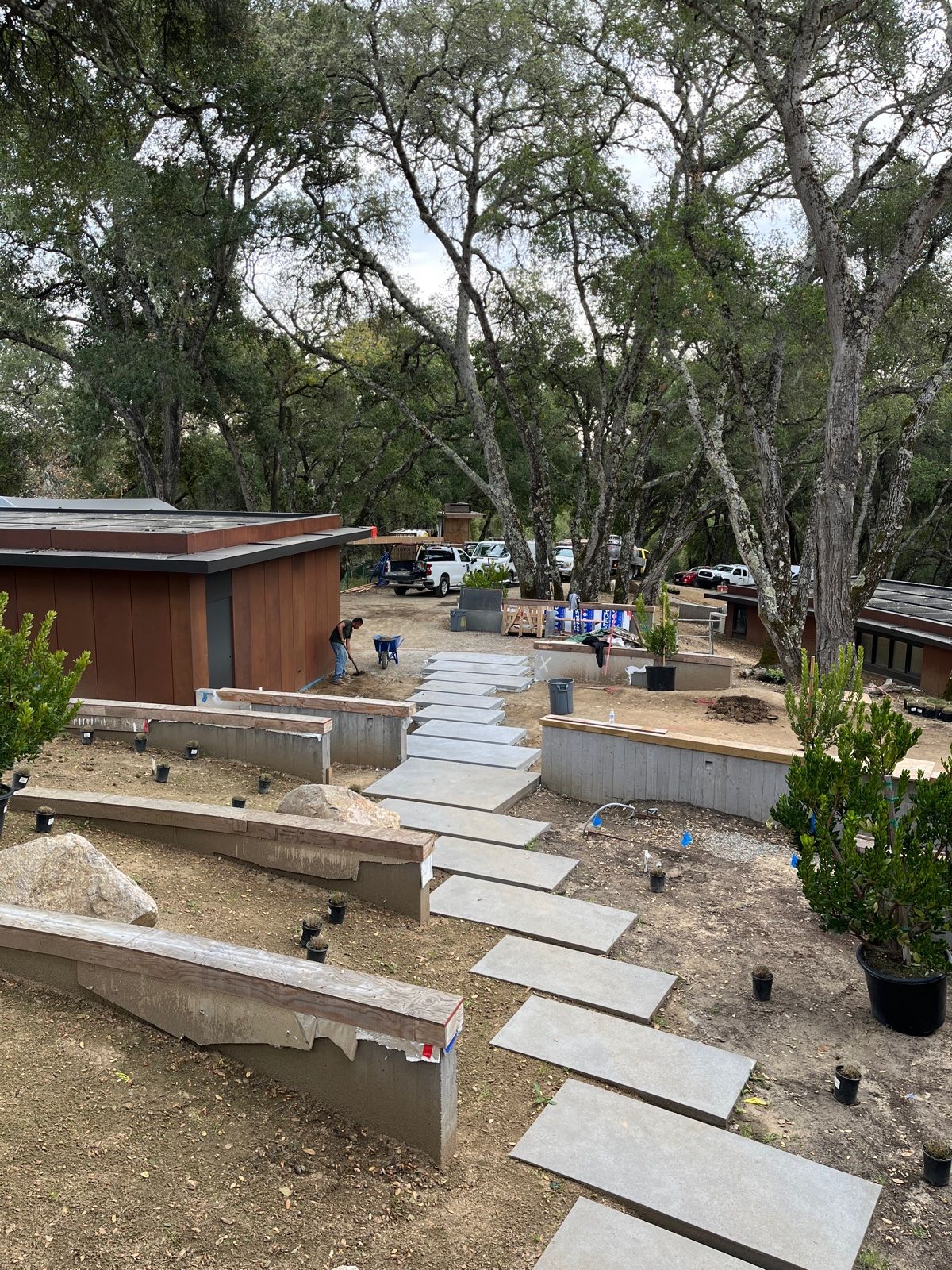 A couple approached our firm with a vision for a new home that fits gracefully and subtly into the land, perfect for gathering and hosting friends and family, immersed in the natural magic of the Santa Lucia Preserve. Prioritizing site-responsiveness, regenerative design, and connection to the outdoors, the design artfully places two gently curved forms within a grove of oaks on a steep hillside, respecting the existing landscape and orienting public and private spaces towards both distant views as well as intimate moments with dense tree canopies.