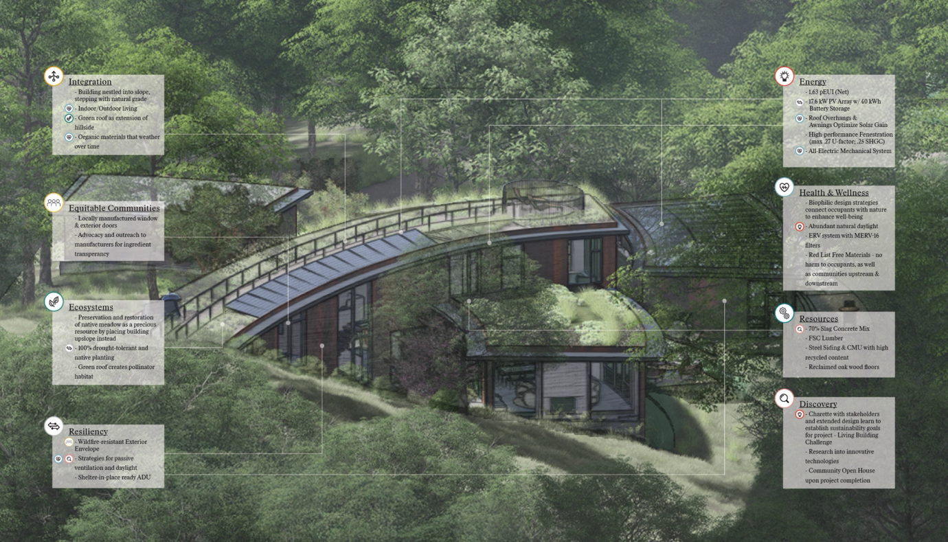 “We wanted to be immersed in nature and connected to the outdoors but sought to have as little effect on the local ecosystem as possible. The design was able to gently weave the house into the existing landscape while prioritizing sustainability, fire resilience, and flexible living. Rather than hiding the solar and water retention efforts, the design highlights these features as the team attempts Living Building Challenge Certification. It’s exciting to see cutting edge design paired with the latest sustainability efforts in such a beautiful way.”