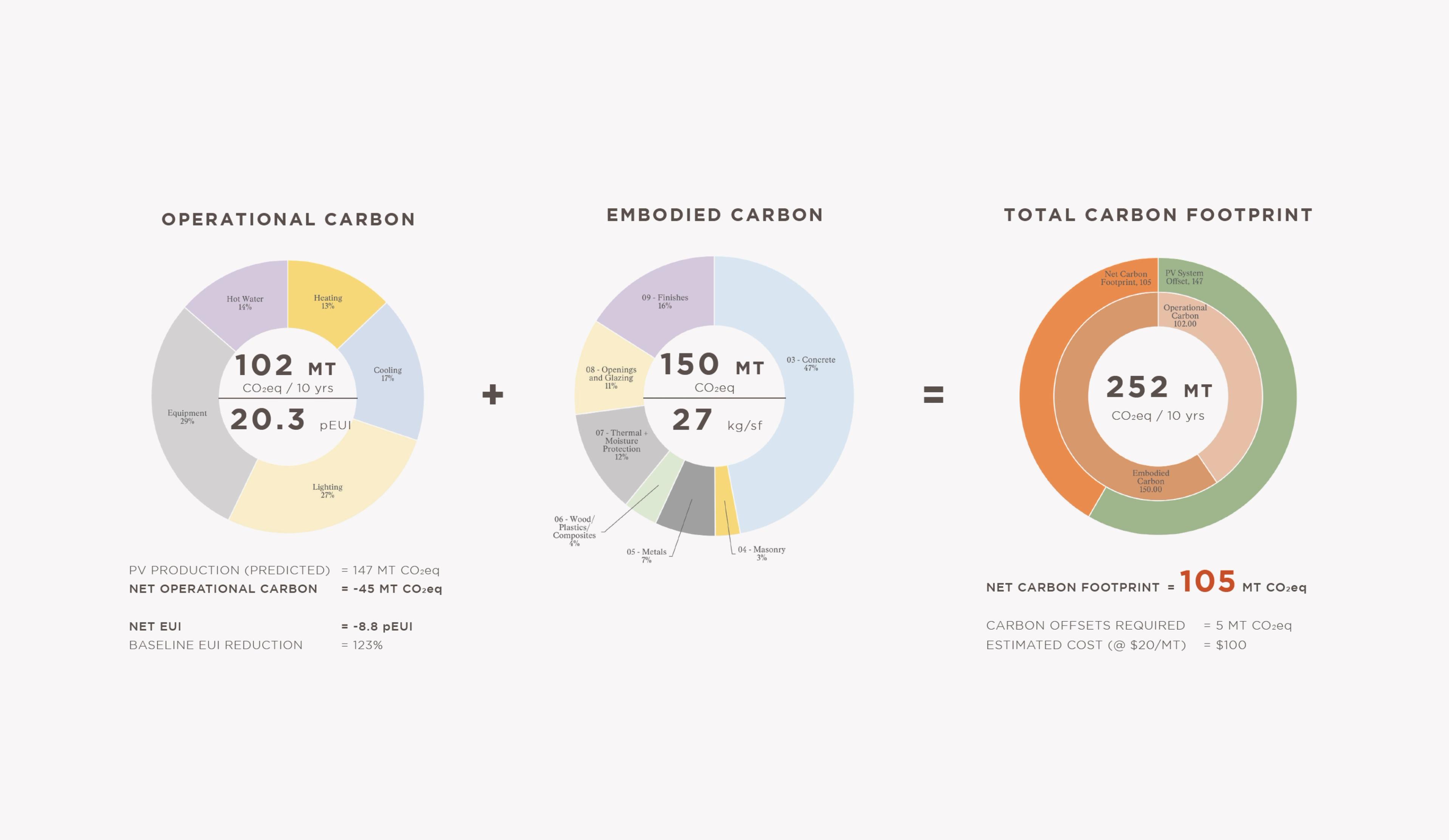 Our Carbon Budget Dashboard tracks each project’s predicted carbon emissions from the design phase through one-year post-occupancy, and continues to account for emissions over a 10-year period. Emissions are broken down into two categories – operational carbon, which refers to the emissions produced by a building during day-to-day operations, such as heating & cooling, lighting, and appliance use; and embodied carbon, which refers to the emissions produced during the extraction, manufacturing, and transportation of building components and materials, and the construction process itself. The dashboard quantifies these predicted emissions, also accounting for the renewable energy or carbon offsets required to meet the 100-tonne budget.