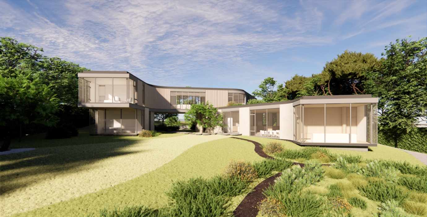 The design team worked to thoughtfully choreograph the folding building forms into the flowing landscape design through a series of iterations of the home's footprint, landing on two organic structures connected gracefully by a second-floor bridge. This layout most sensitively interacts with the site, providing a sense of compression upon entry, and release into the landscape beyond.