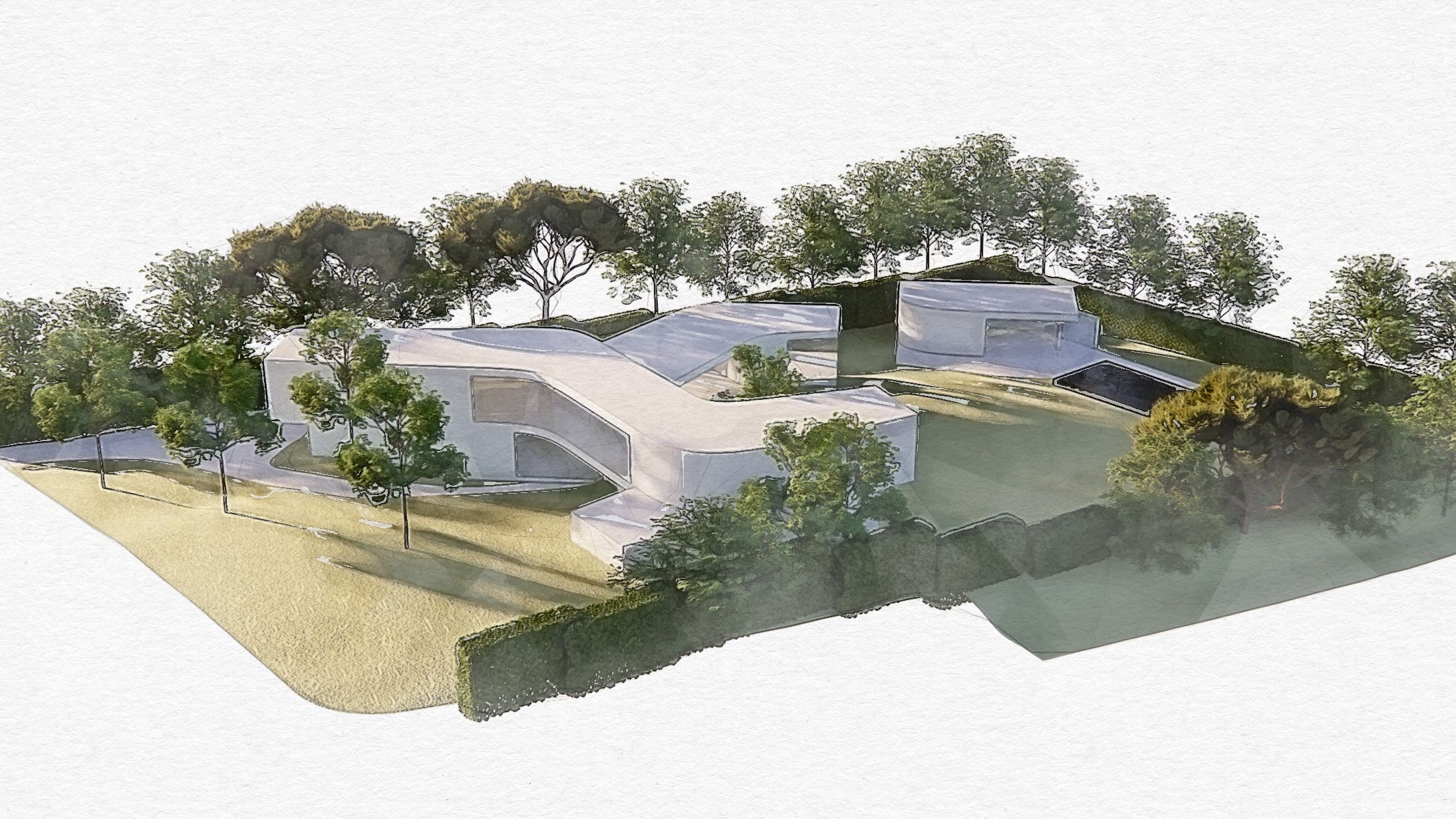 The design team worked to thoughtfully choreograph the folding building forms into the flowing landscape design through a series of iterations of the home's footprint, landing on two organic structures connected gracefully by a second-floor bridge. This layout most sensitively interacts with the site, providing a sense of compression upon entry, and release into the landscape beyond.