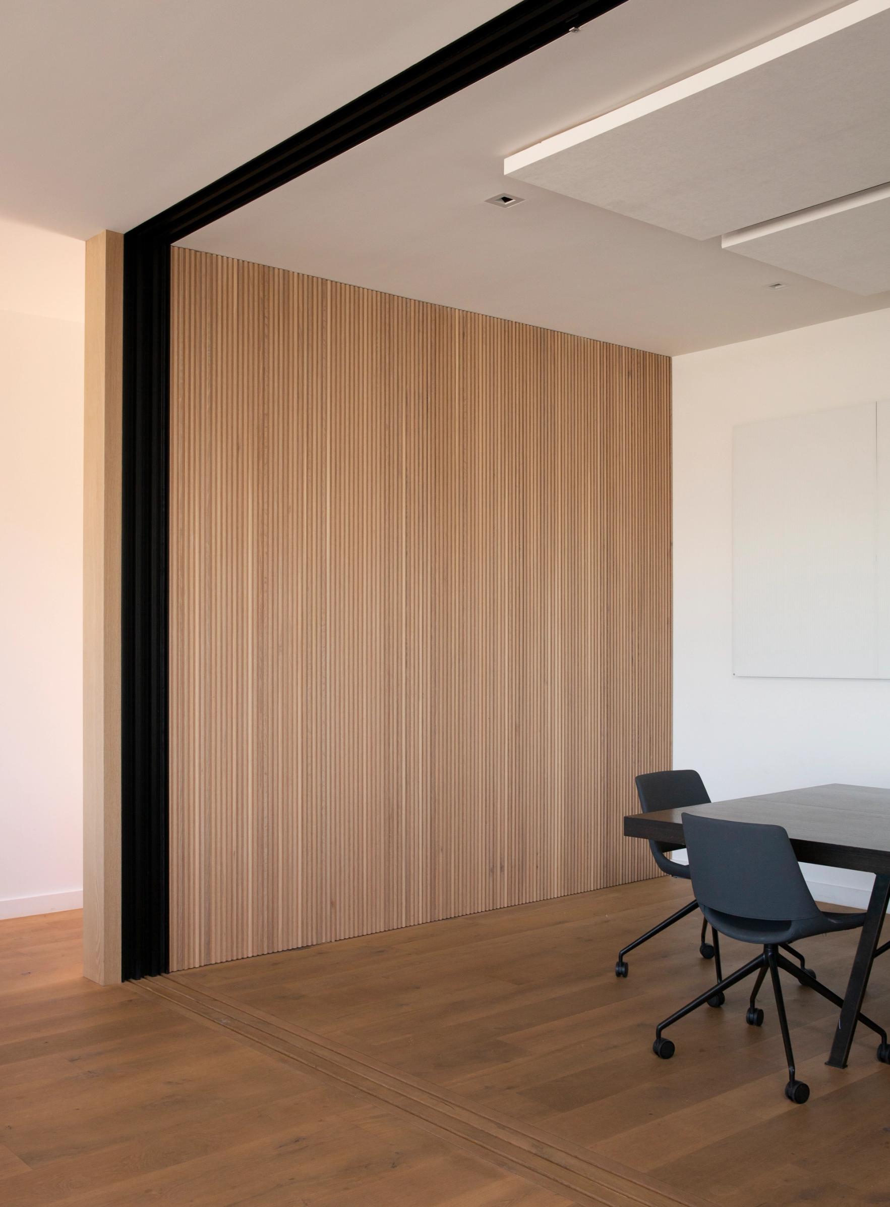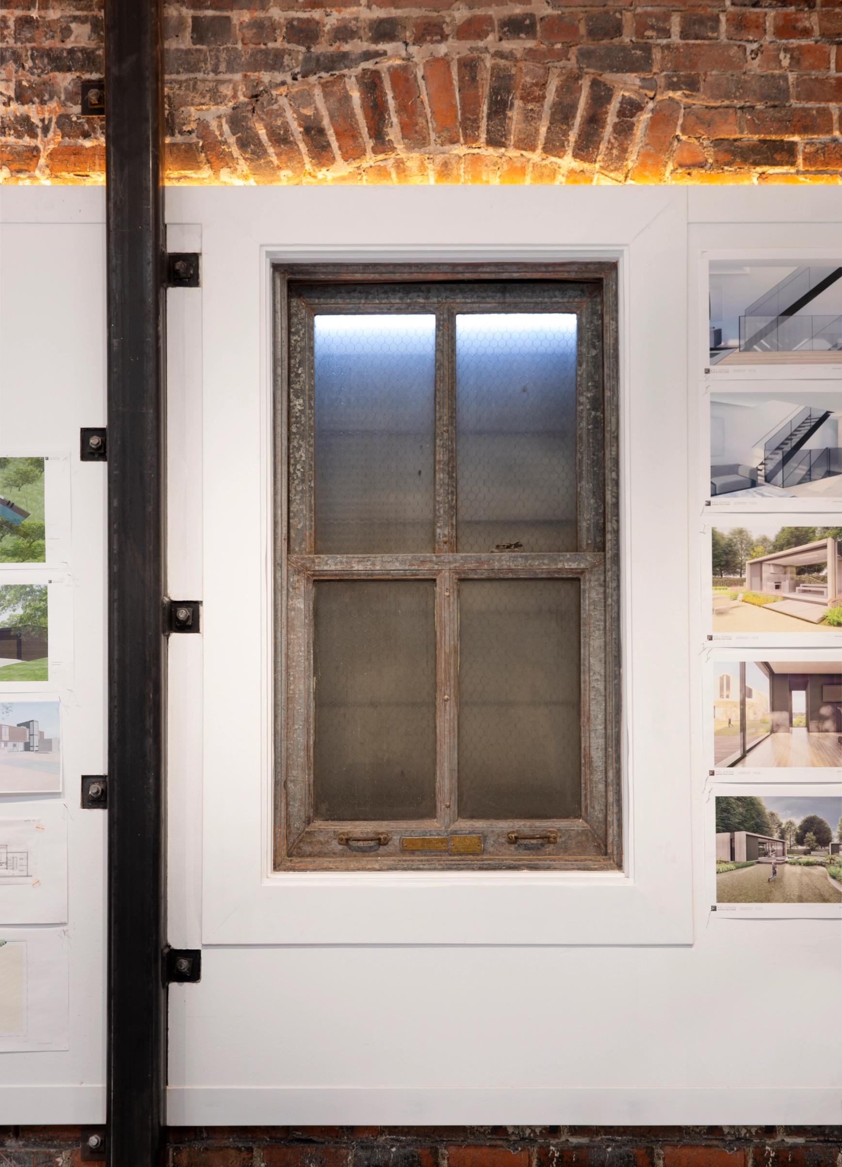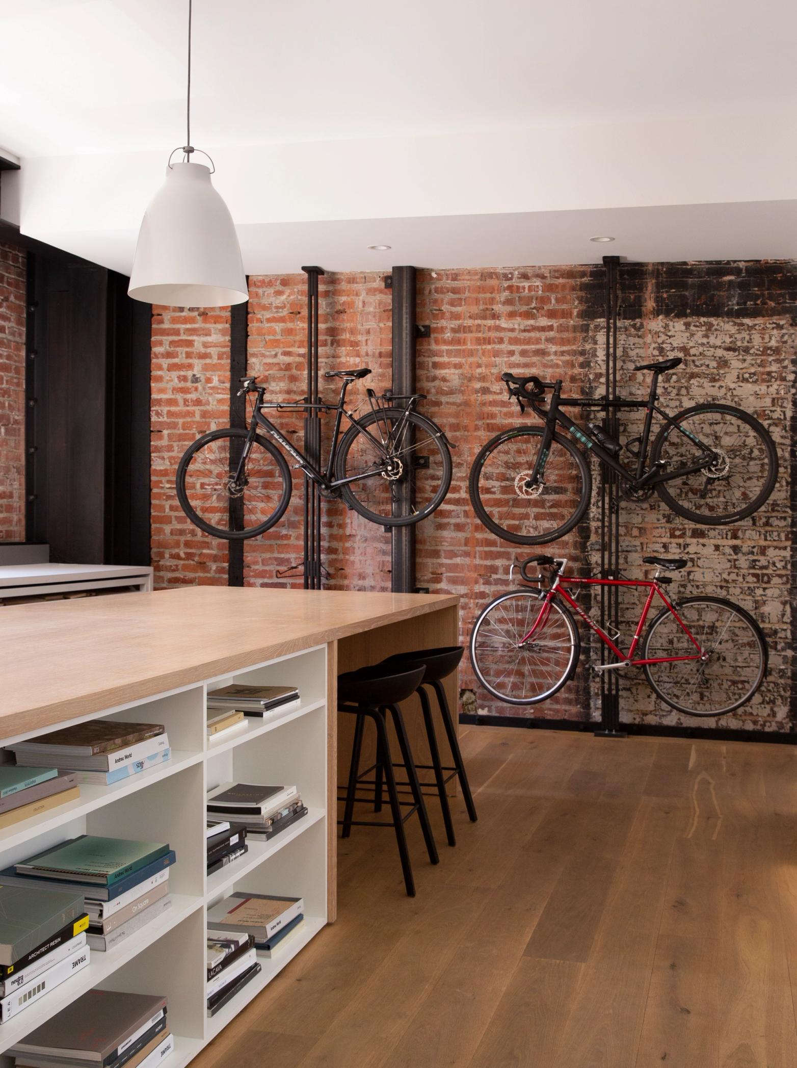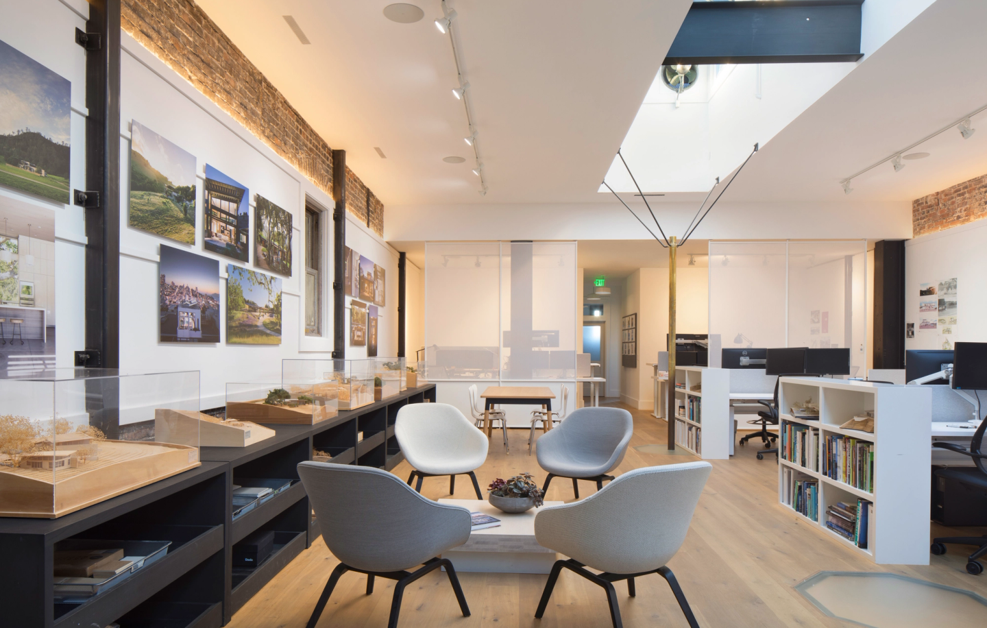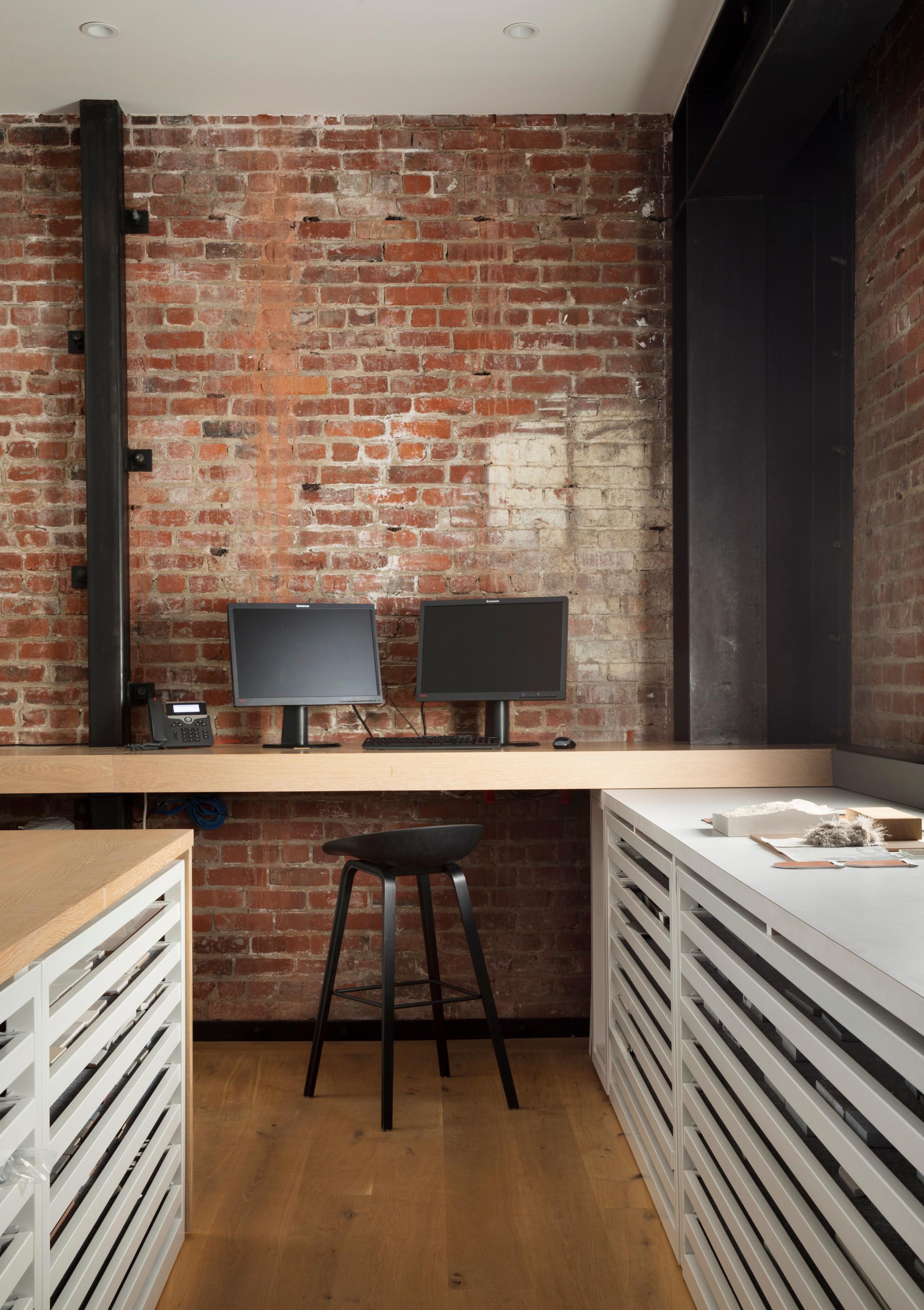 Acting as the living room, the open concept design studio is punctuated with crisp white bookshelves and modern detailing, which stands in contrast with the fire house’s original weathered bones and exposed steel beams. Recess lighting accentuates white wooden panels sprinkled with the firm’s recent work, revealing the rough brick above and below, and creating a softly lit, warm atmospheric mood often found in our homes.