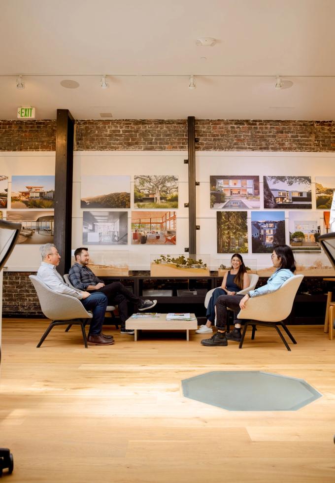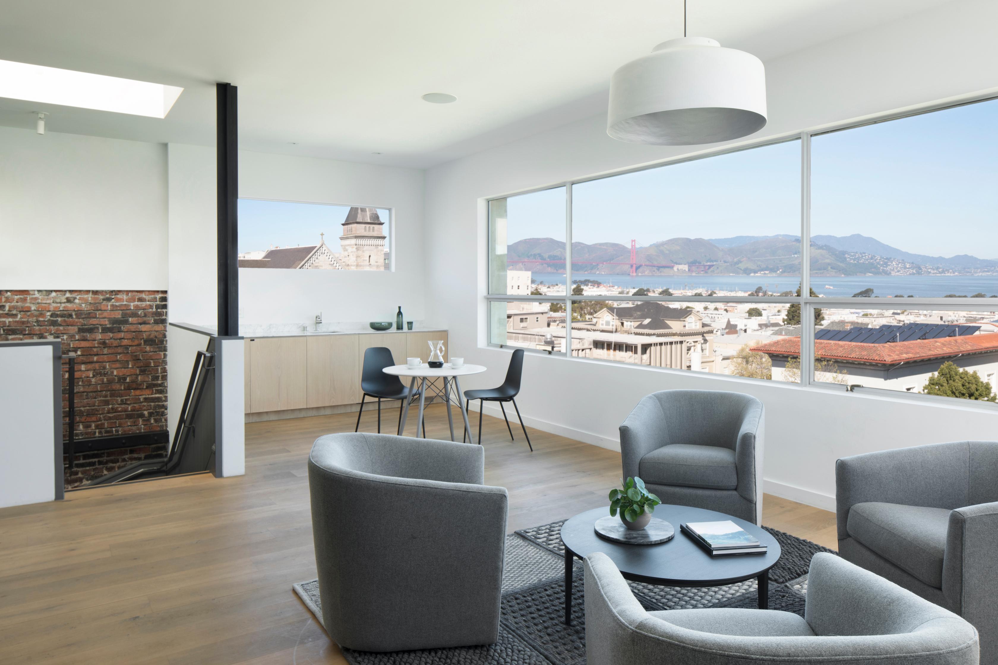 The “wow moment” rests on the top floor of the building, a conference room, wet bar, and sitting room lined with glass windows, featuring sweeping views of the San Francisco Bay, the Golden Gate Bridge, and the surrounding Pacific Heights neighborhood. The top floor easily and comfortably converts into an entertaining space - seamlessly offering a space to host larger meetings, cultural events, talks, and parties, which at times spill out onto the scenic roof deck.