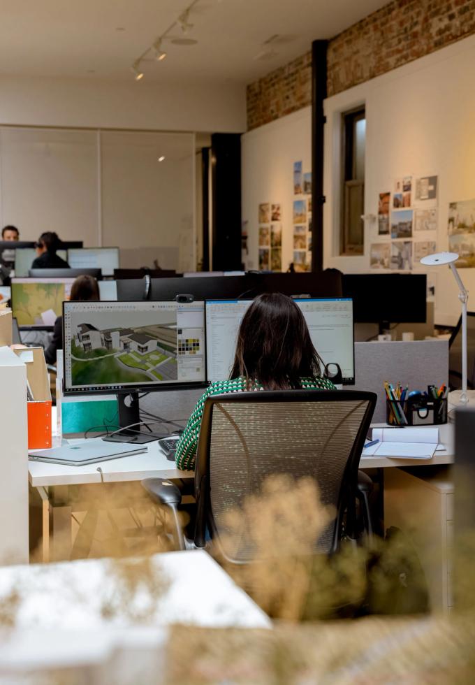 A 1916 landmark building and fire station turned Feldman Architecture headquarters, Engine Company No. 8’s rustic bones and sweeping skylights held great potential for a welcoming, open floor workspace flooded with light. Our team looked to honor the original design of the historic building by accentuating its beautifully weathered exposed brick walls and elegant steel beams.