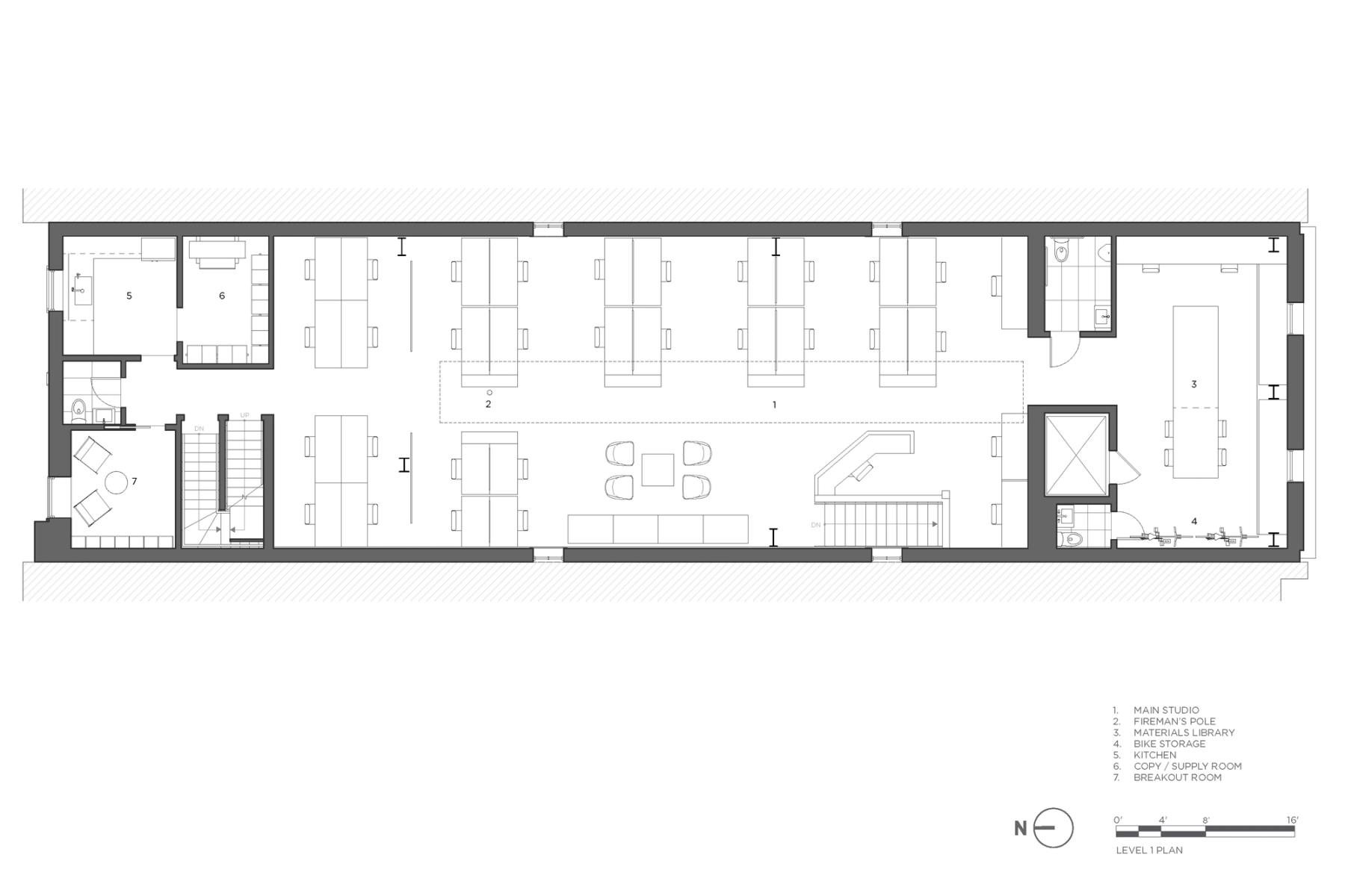 The office flaunts a variety of social spaces and private nooks, beginning with the materials library at the front of the building, housing a variety of architectural tools and a large wooden table for creating and collaborating. The entryway is situated for hosting clients and welcoming visitors; a sitting area centered around a light wood coffee table lends itself to casual meetings and catch ups. The open office space naturally flows into the kitchen, outfitted with all new appliances and sleek dark grey cabinetry- aesthetically connected to the space with more exposed brick.