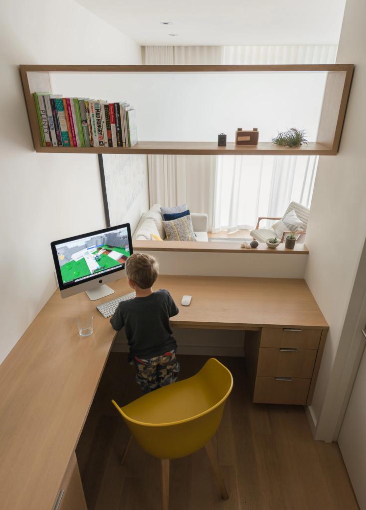The metal-screened stair leads from the street-level entry to the upper floors, where a catwalk connects the bedrooms and rings the atrium. The primary suite is located along the rear of the upper level with a floor-to-ceiling window that provides strong visual connection to the rear yard. In the children’s bedrooms, loft areas take advantage of the verticality of the space and connect the rooms via a hidden passage door for the kids to crawl through.
