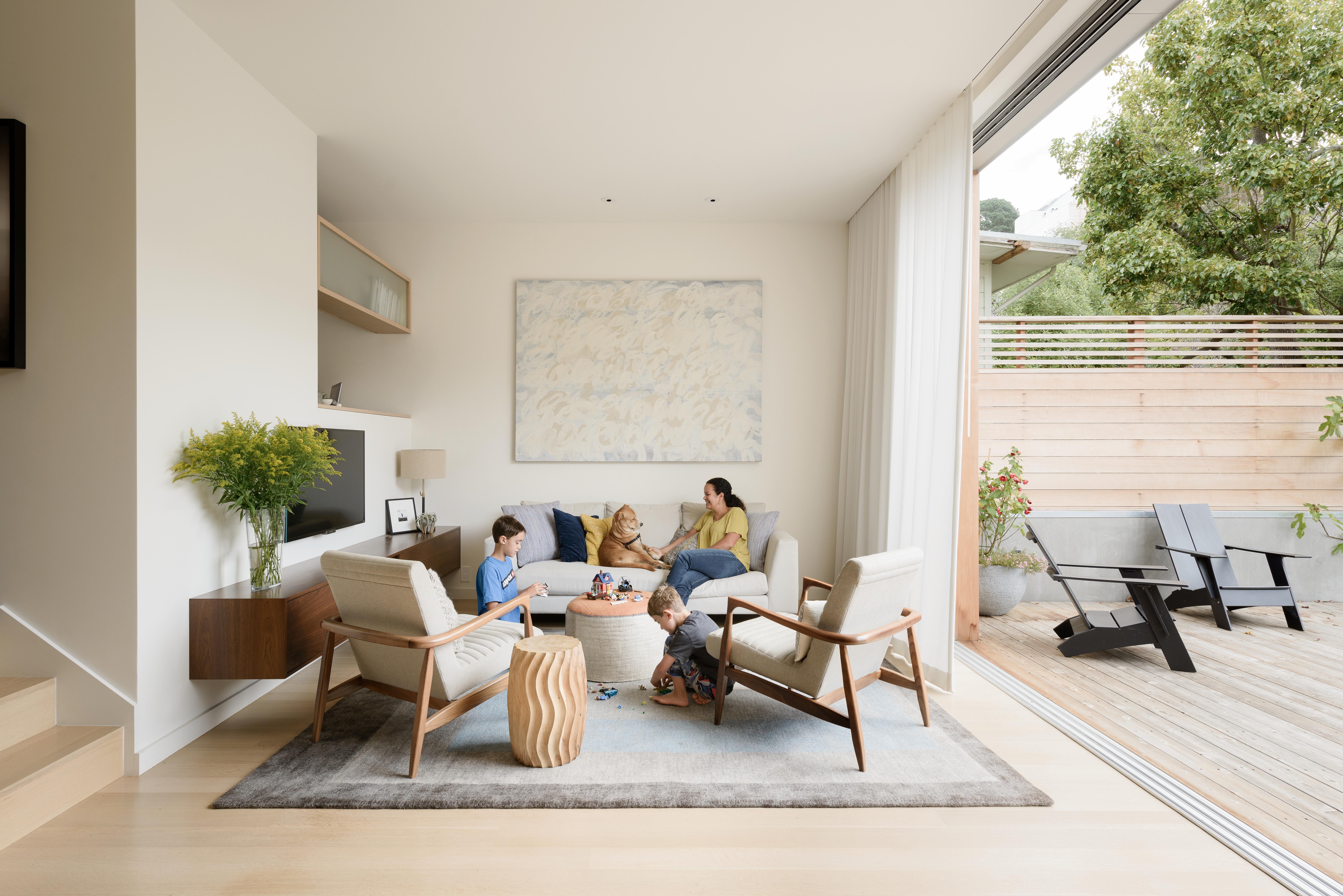 On the main floor, an open plan kitchen, living, and dining area opens upward to the ceiling, bringing light down from two stories above. Nooks and innovative storage solutions allow the space to serve as the hub of the household without clutter. The living room flows out onto a deck and into the backyard, providing indoor and outdoor living and play spaces.