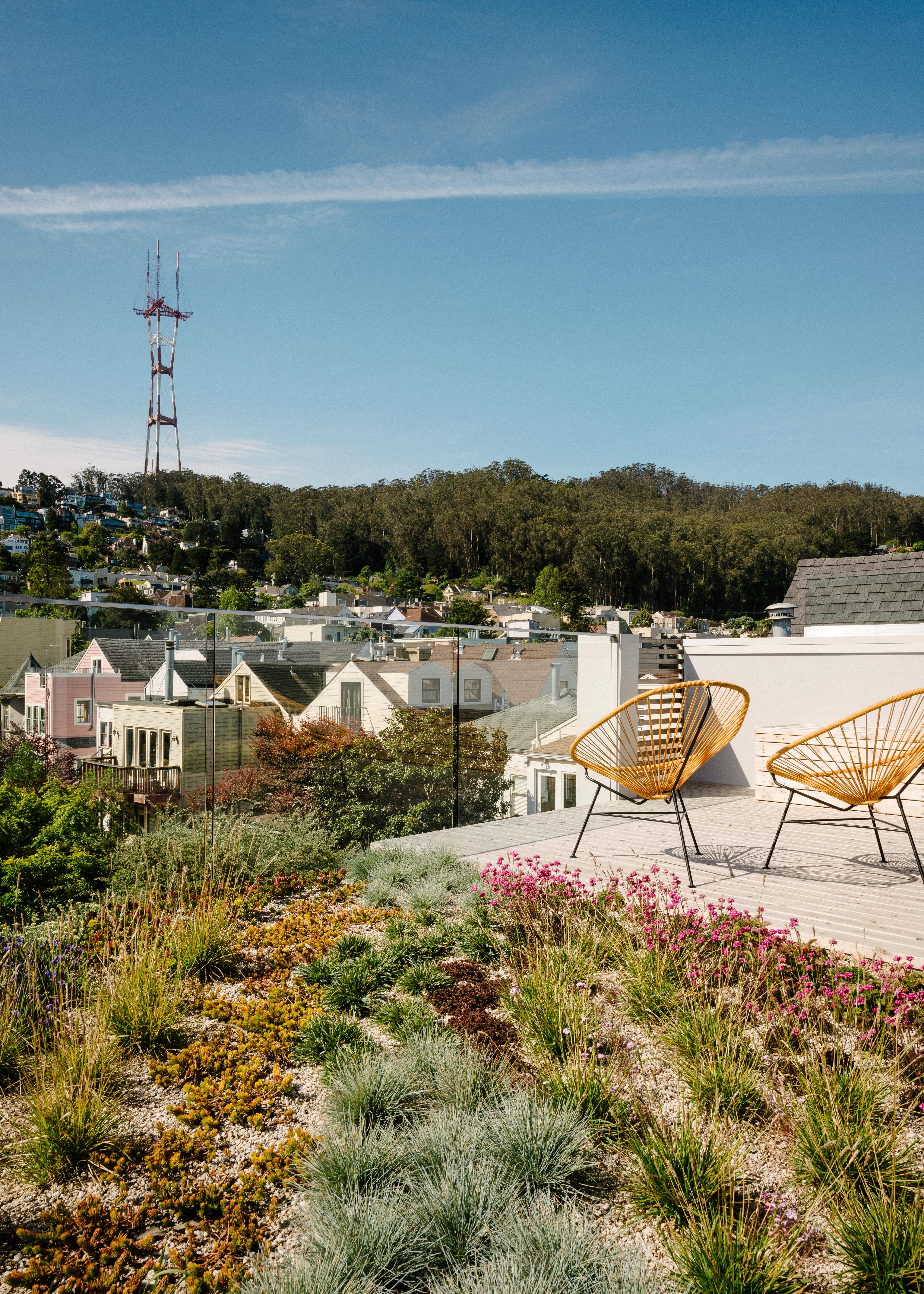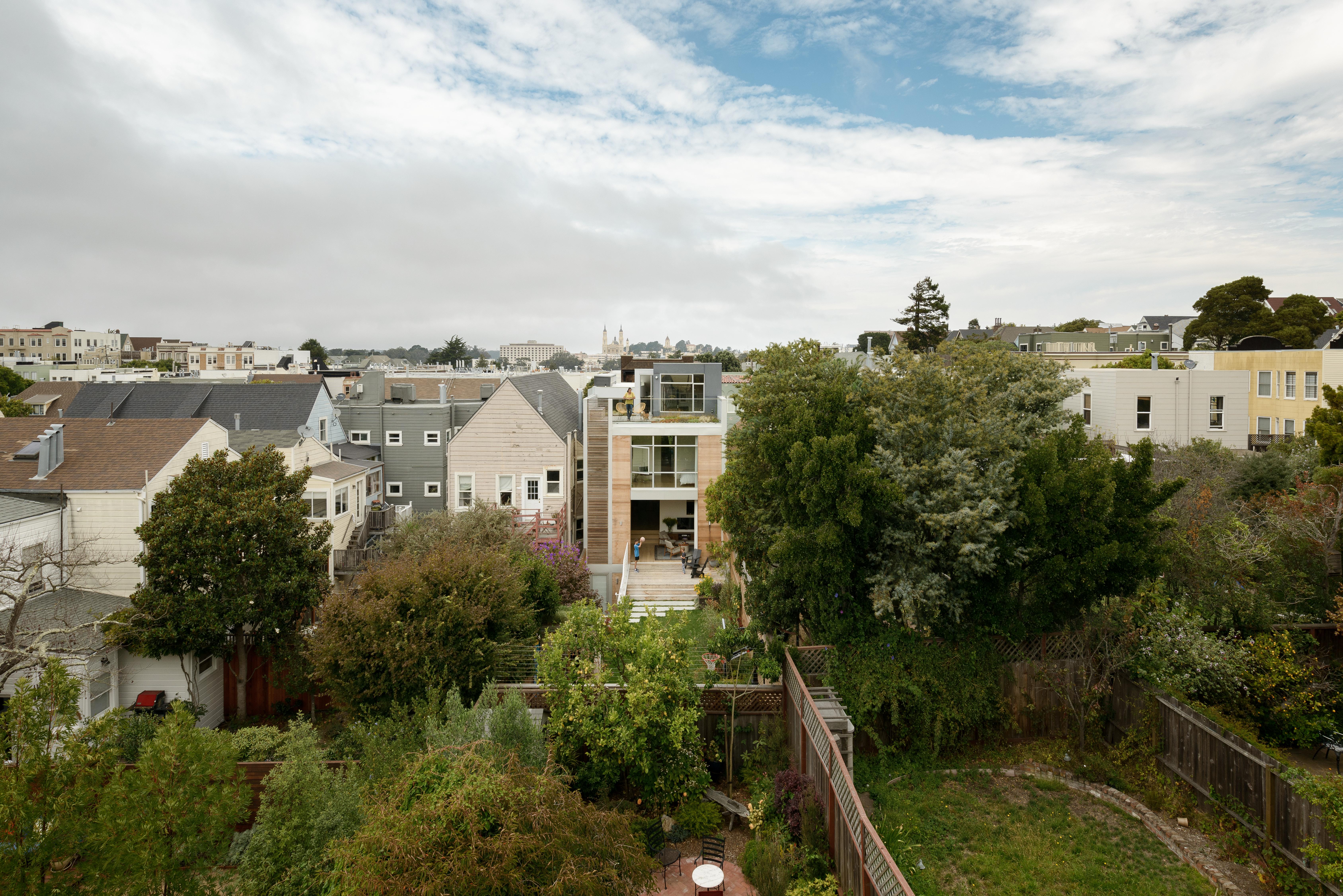 The metal-screened stair leads from the street-level entry to the upper floors, where a catwalk connects the bedrooms and rings the atrium. The primary suite is located along the rear of the upper level with a floor-to-ceiling window that provides strong visual connection to the rear yard. In the children’s bedrooms, loft areas take advantage of the verticality of the space and connect the rooms via a hidden passage door for the kids to crawl through.