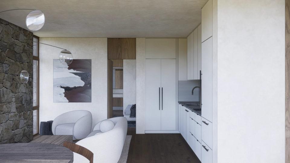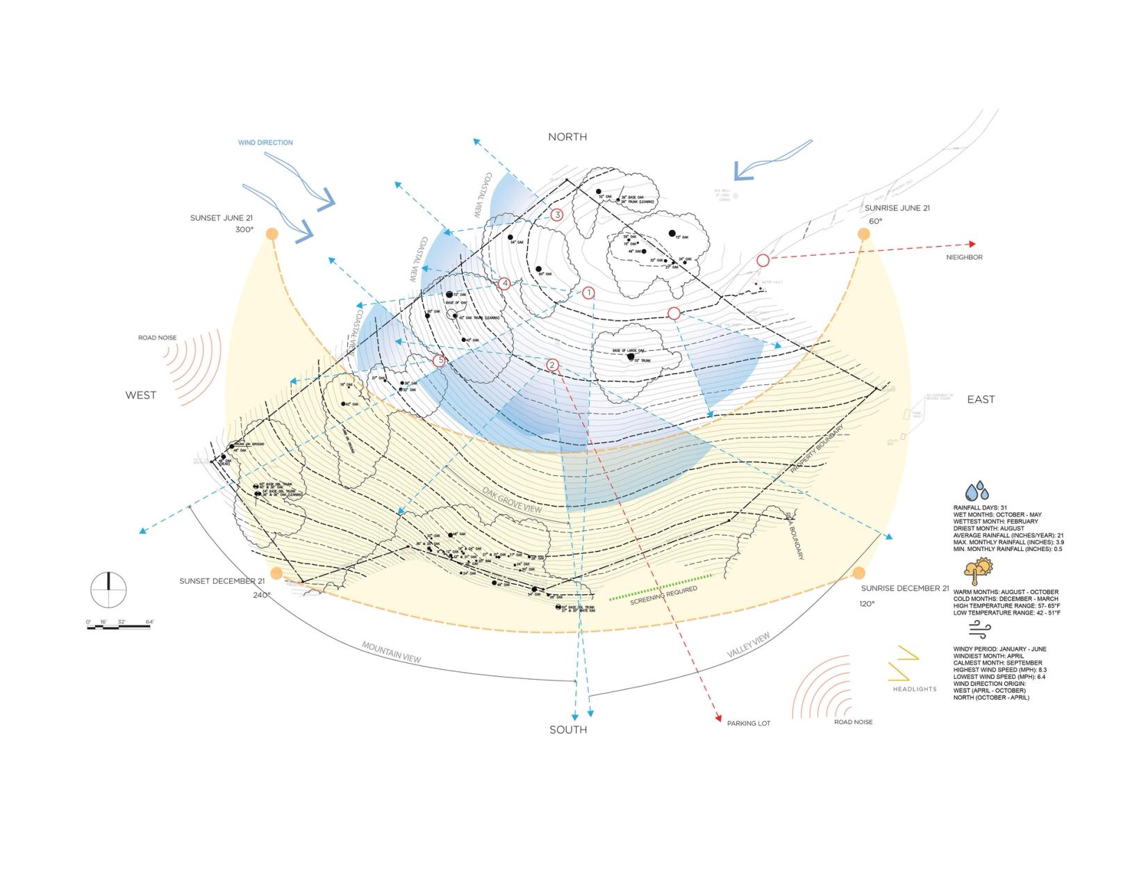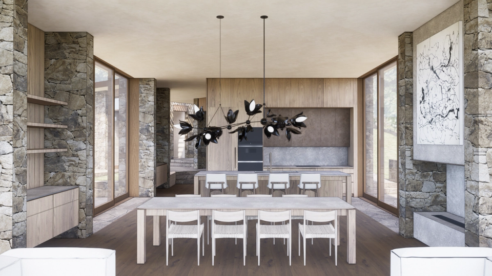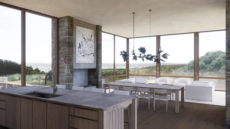 The dynamic site allowed our team to leverage solar orientation and western winds for effective passive heating and cooling strategies - the home will aim to be net zero, relying completely on solar power. The stone material palette and green roofs blend subtly into the surrounding landscape, integrating fire resiliency naturally into the design.