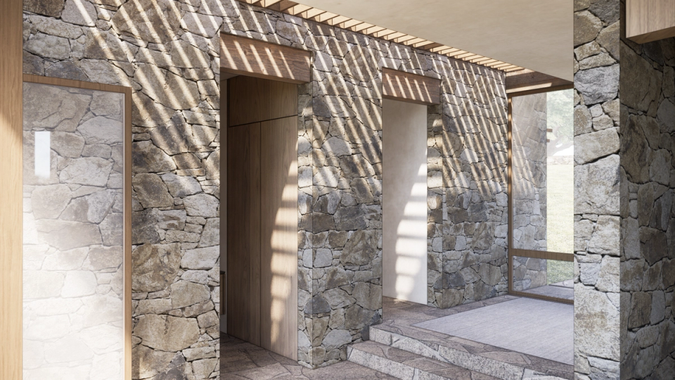Stone carries from exterior to interior, creating a fluid visual, material, and textural language.