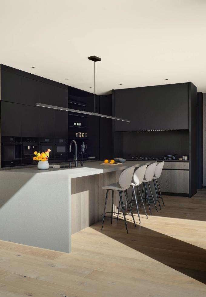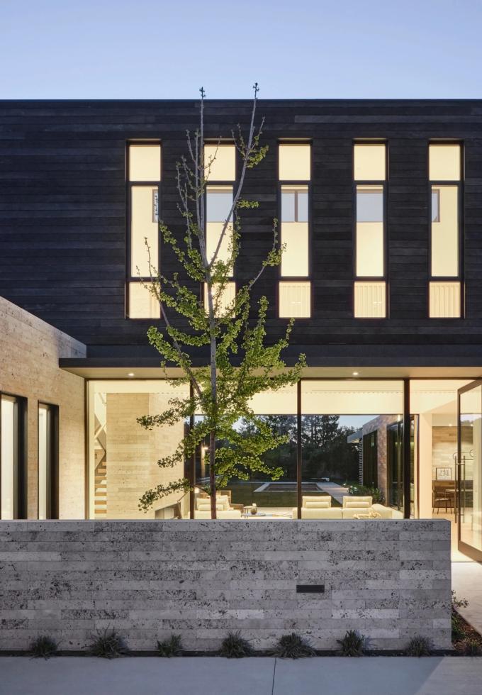 The home’s materiality is subtle and refined, allowing natural textures to create visual contrast. The exterior is clad with bush-hammered travertine and reclaimed Ulin wood siding. A simple, warm interior palette of white oak paneling, black Fenix laminate, and white marble with brass accents allows the surrounding landscape to add color and light. Understated, comfortable furnishings accented with the daughter’s hand sketches create a warm, open, materially rich space deeply and intimately connected to the site and its occupants.