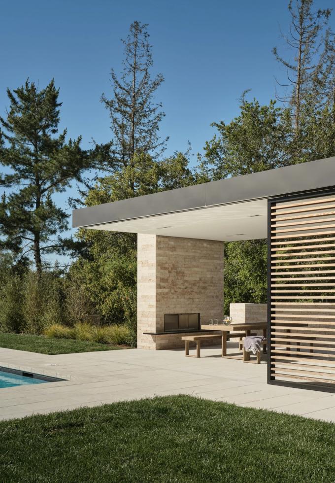 A subterranean level houses the office, guest room, and nanny suite, complimented by lightwells that welcome natural light into each space. The office connects via an outdoor staircase to the covered patio - a primary outdoor gathering space for friends and family, with a fireplace and moveable wood slatted screens allowing flexibility to control exposure to southern sunlight.