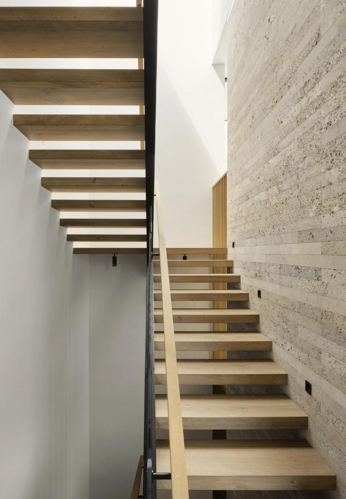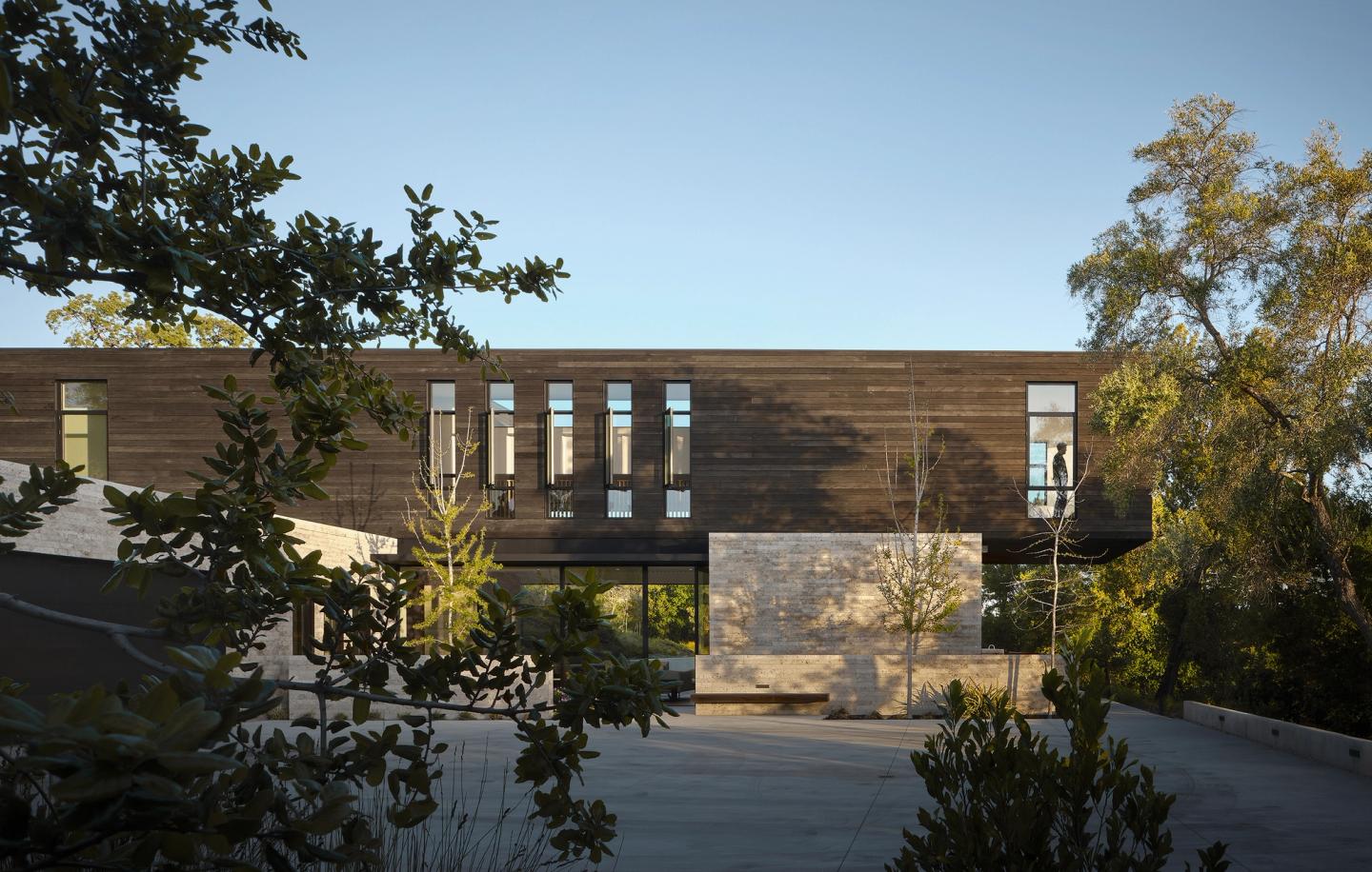 Supported by the lower level on one end and the hillside on the other, the private second floor is balanced gracefully atop its lower counterpart. The primary suite lightly floats above a grove of mature oaks, overlooking distant views of the San Francisco Bay to the north. On the opposite end, the twins’ rooms mirror each other as to “not to favor one over the other”, equally divided by a shared study nook. A double height stone clad fireplace connects the first and second floors, and wood slats splash patterns of daylight onto a rich material palette.