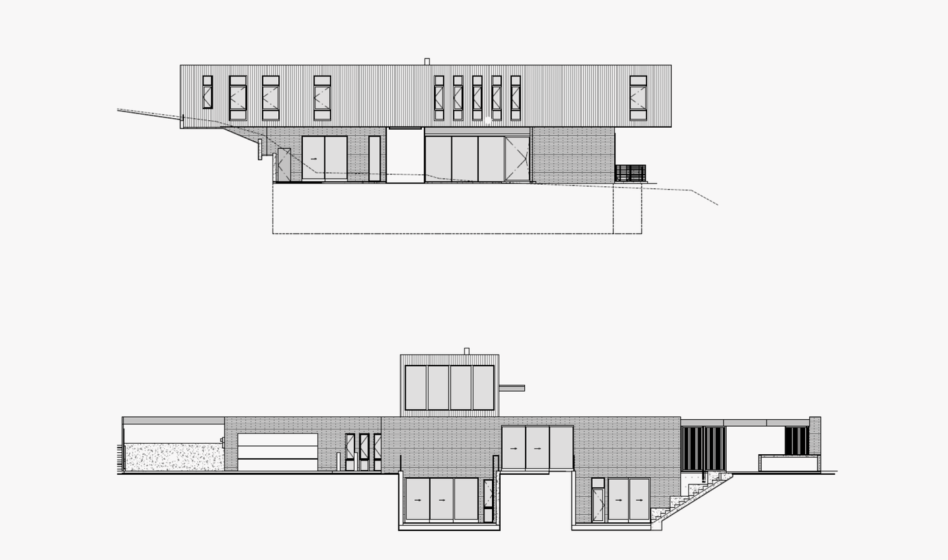 The private site is situated on a flag lot, surrounded by open space with mature perimeter trees and vegetation. The structure consists of two forms layered perpendicularly. On the ground level, a kitchen, dining, and family room flow naturally into outdoor living spaces, centered around a passively cooled double-height living room that pulls cold air from lower levels to the warmer second story via strategically placed windows. A covered patio at the rear of the house and trellis at the front foster a sense of openness; the surrounding scenery is framed thoughtfully by architecture, becoming almost transparent. The L-shaped structure nestles a protected, private courtyard and pool between the house and hillside, which directly connects to the guest suite. The suite is thoughtfully designed as a space for the client’s visiting parents.