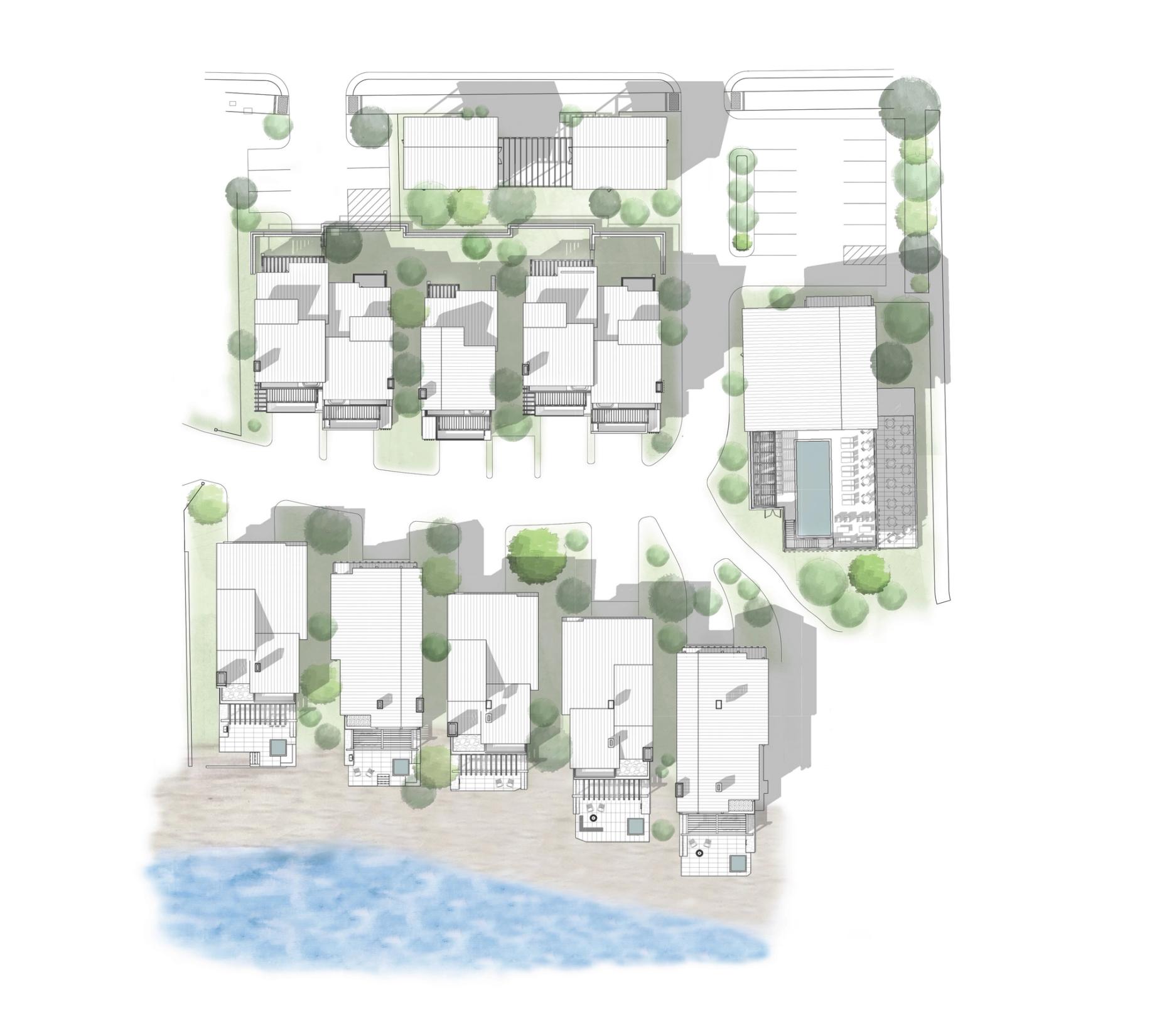 Five single family custom homes will sit along the public beach, with five 3-level condos nestled close behind. Lakeside access is available to each structure, with the waves able to reach the deck of the custom homes at high tide. In order to maintain view corridors from the street, the condos sit in pairs, slightly shifted mirror images of each other. Metal pitched and butterfly roofs, as well as a metal trim add a modern sophistication to an otherwise classic silhouette.