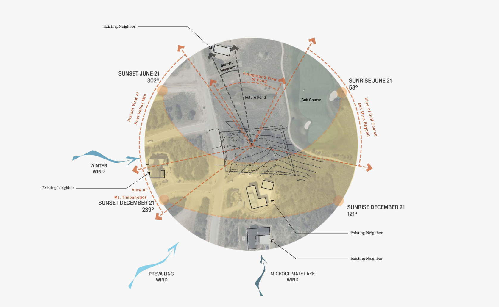 After an in-depth site-analysis, the design team iterated through a handful of schemes, ultimately selecting the Boomerang, which thoughtfully protects and shields occupants from prevailing northern winds and provides privacy from close-by neighboring properties. The Great Room is perched at the structure’s elbow, taking advantage of the property’s most scenic distant mountain vistas, as well as Golf Course and pond views in the foreground. The Primary Bedroom is nestled into a protected nook, with a unique vantage point of a rock formation.