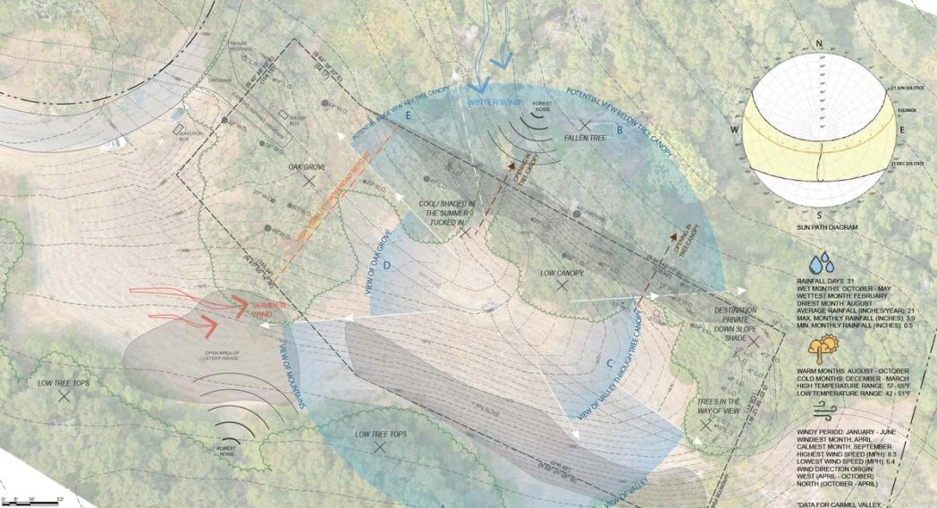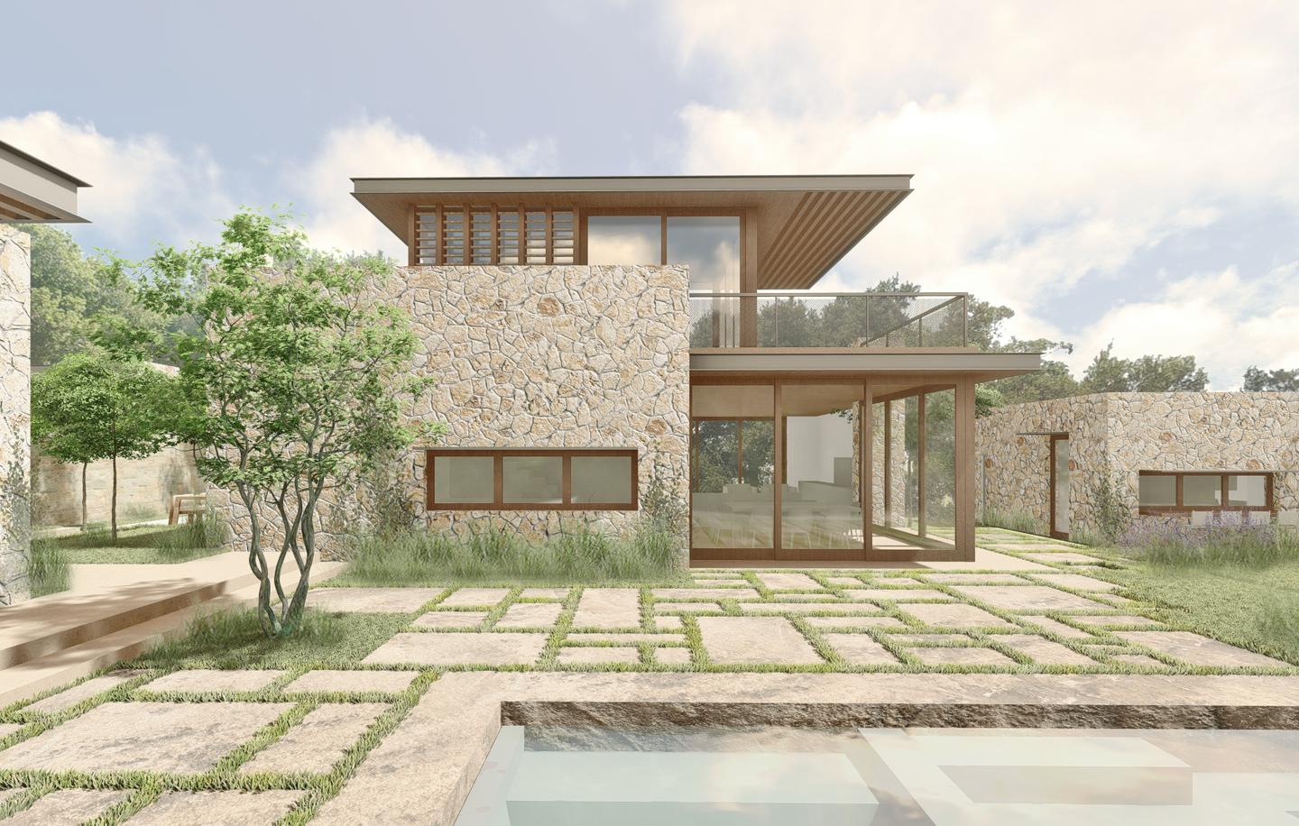 The design situates four autonomous stone structures in a one acre clearing on a ridge, overlooking an open valley to the east and surrounded by coast live oaks. The structures - a living pavilion, the owner’s suite and office pavilion, a pool cabana/guest suite, and a garage - are stitched together by exterior pathways, gardens, and courtyards, prioritizing indoor-outdoor connections. Strategically located to immerse occupants in the landscape and fill each space with natural daylight, thickened walls of local granite ground the pavilions and carved corners capture views of the valley through openings in tree canopies.