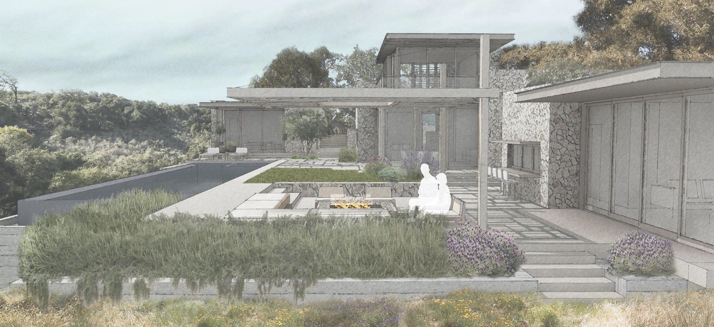 The design situates four autonomous stone structures in a one acre clearing on a ridge, overlooking an open valley to the east and surrounded by coast live oaks. The structures - a living pavilion, the owner’s suite and office pavilion, a pool cabana/guest suite, and a garage - are stitched together by exterior pathways, gardens, and courtyards, prioritizing indoor-outdoor connections. Strategically located to immerse occupants in the landscape and fill each space with natural daylight, thickened walls of local granite ground the pavilions and carved corners capture views of the valley through openings in tree canopies.