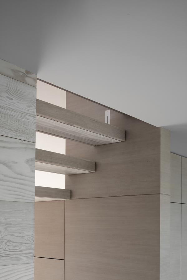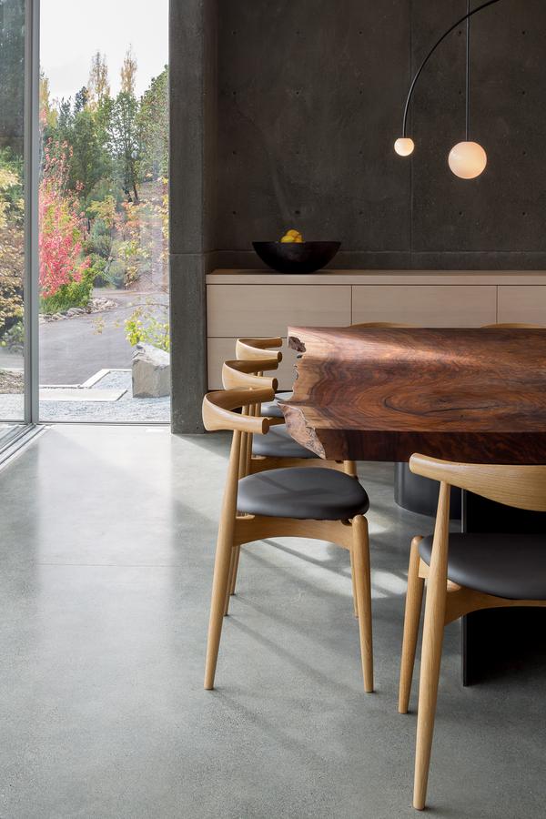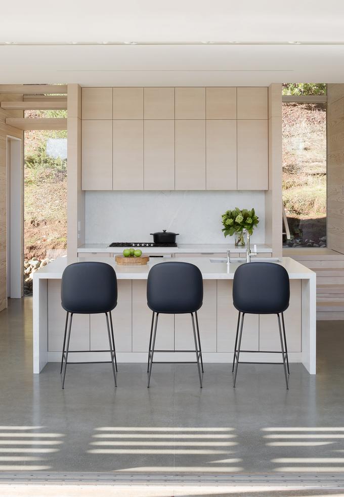 The interior has a pared-down material palette consisting of bleached Douglas fir, white Carrara marble, and concrete floors. Minimalists by nature, the clients craved simplicity without starkness; accents of bronze, blackened steel, and Claro walnut bring richness to the interior furnishings, balancing the austere nature of concrete and steel.
