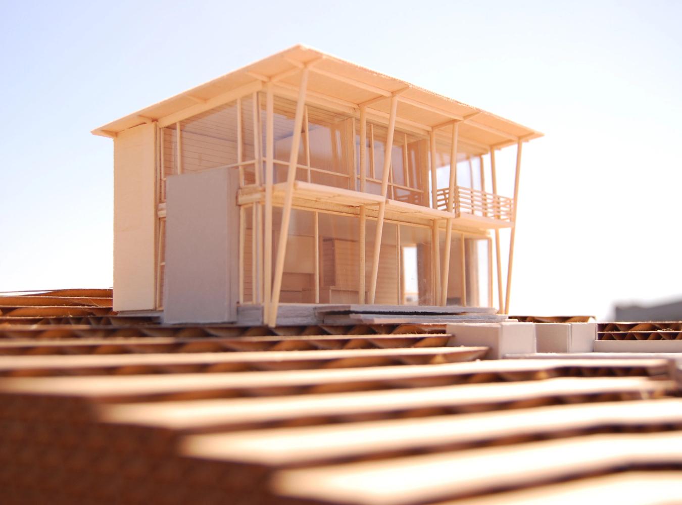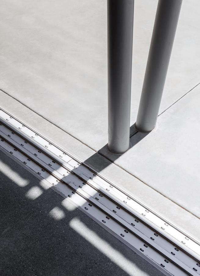 To preserve the elegant quality of the desired “glass house”, the structure of the home is expressed on the exterior. Round steel columns stretch upwards across two stories to support the sunshade and thin corrugated metal roof; balancing modern lines with delicate panes of glass. Two monolithic concrete forms at the East and West facades provide both structure and storage while visually anchoring the building to the site.