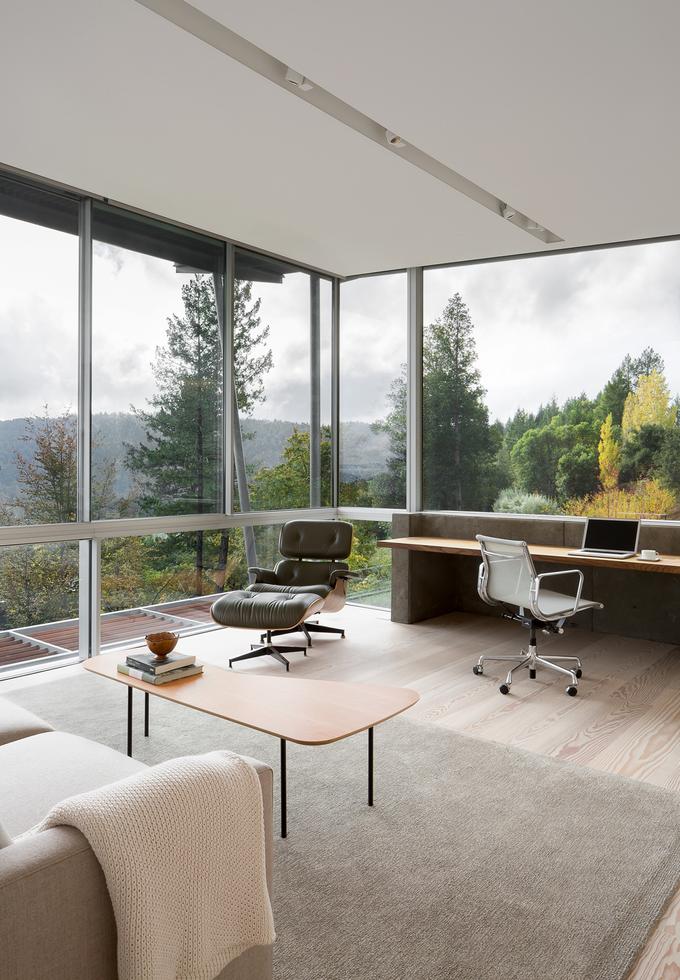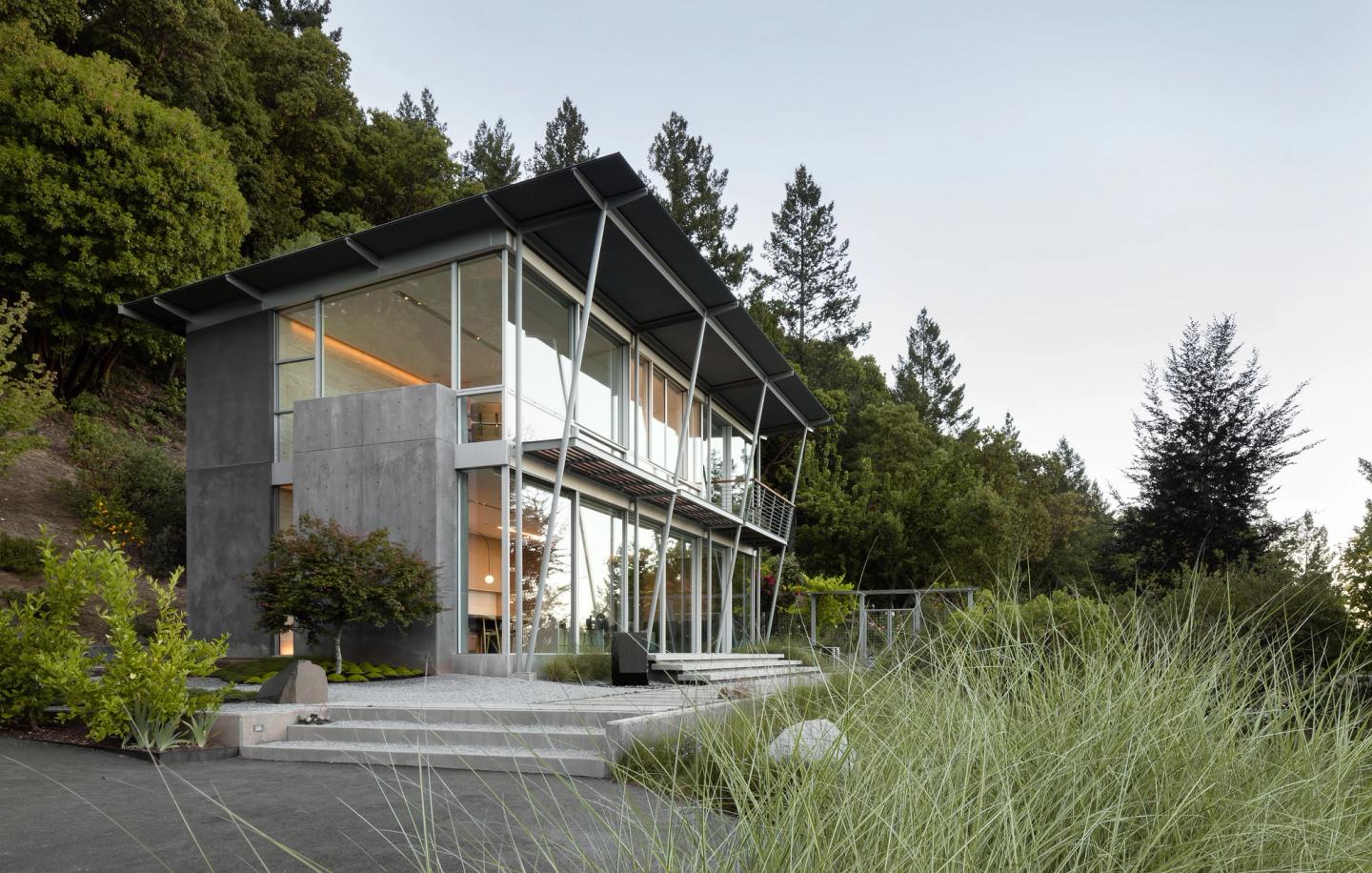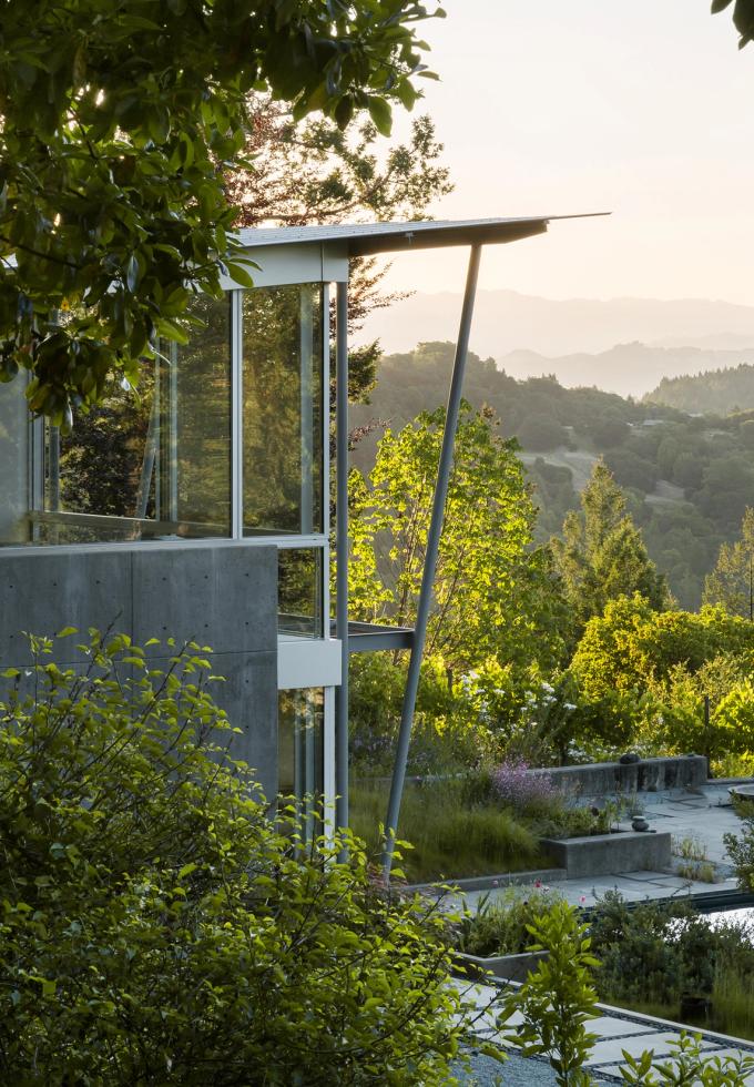 Glass walls on three sides of the home allow for a strong physical and visual connection to the landscape, including the adjacent gardens and orchards, and the distant Mt. Saint Helena.