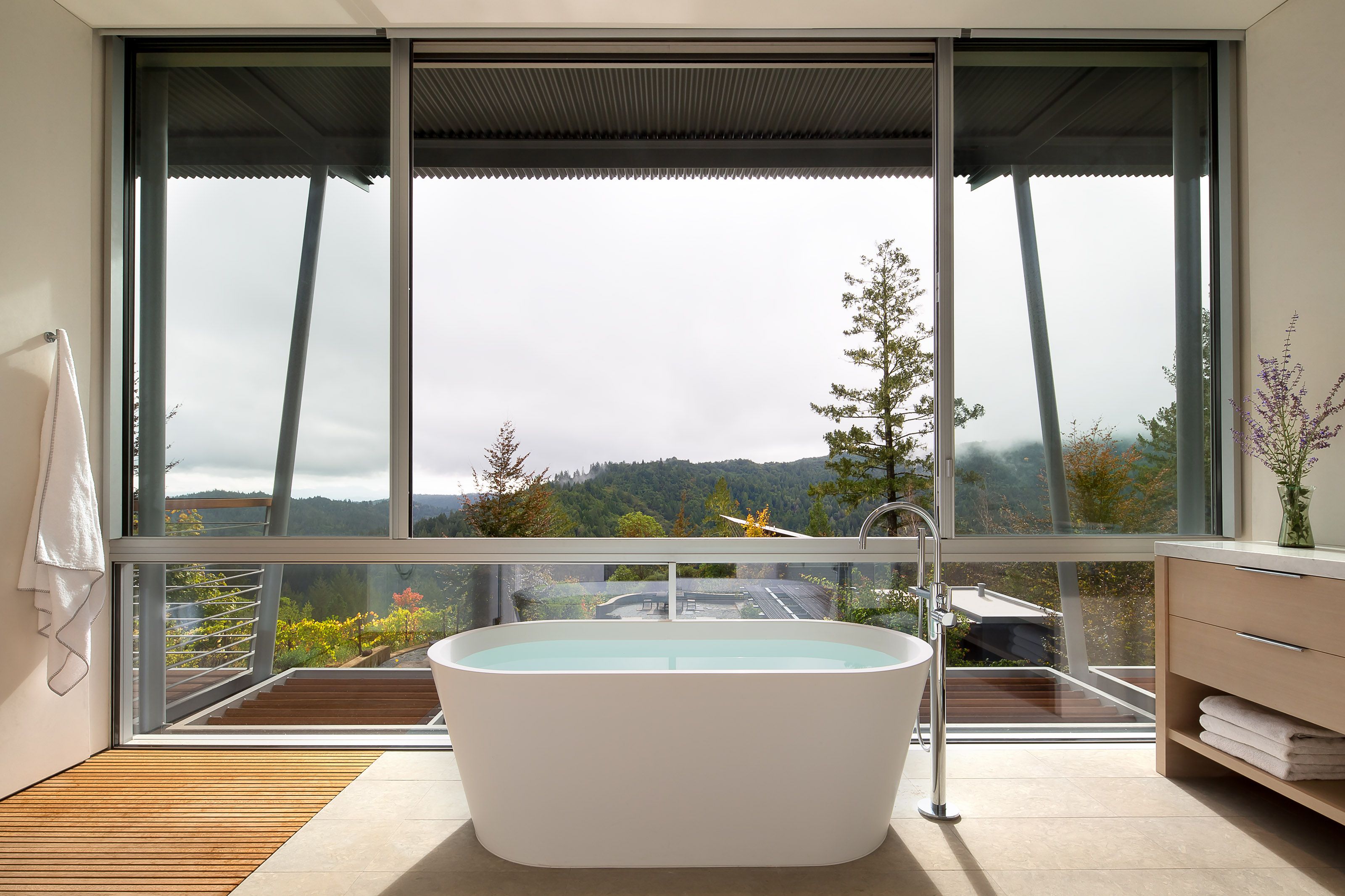 Glass walls on three sides of the home allow for a strong physical and visual connection to the landscape, including the adjacent gardens and orchards, and the distant Mt. Saint Helena.