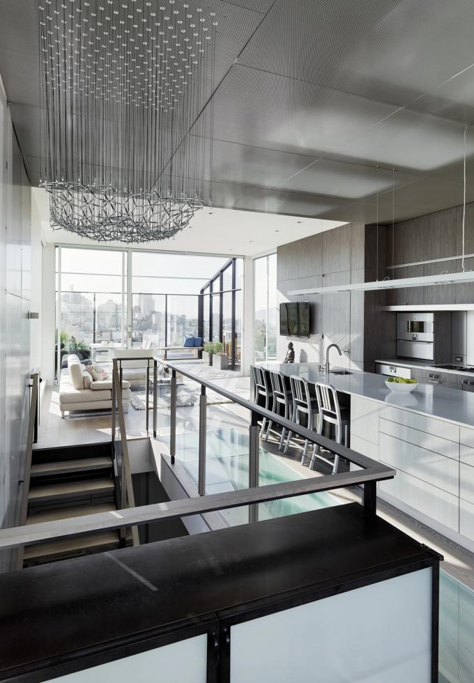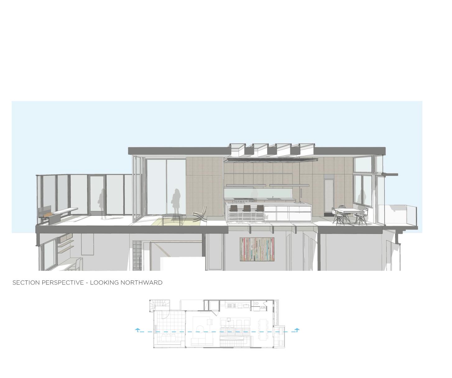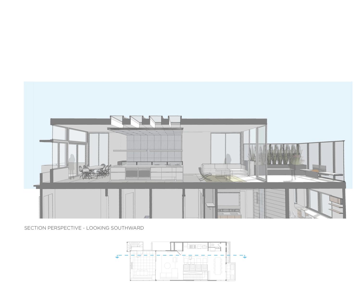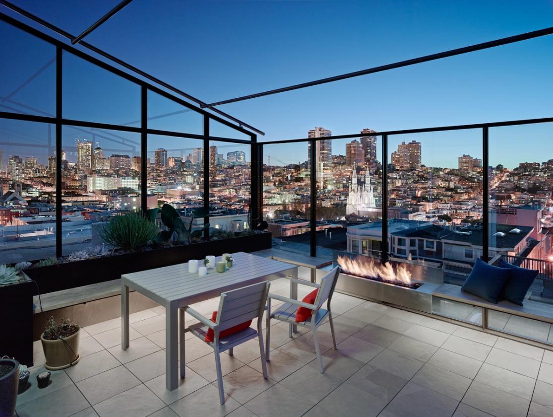 The top floor’s envelope was pulled back from the lower façade and transformed into a metal and glass wrapped penthouse volume that sits lightly atop the main façade. Upon entering the main unit, a light drenched wood, steel, and glass stair pulls visitors upward. By relocating the main bedroom from the top to the middle level, the penthouse level opens as one great room with windows on three sides. An open kitchen with ample storage serves the needs of clients who love to cook and entertain. The main deck takes advantage of the sweeping views and serves as an outdoor room with a fireplace, windscreen, custom planters, and an operable awning.