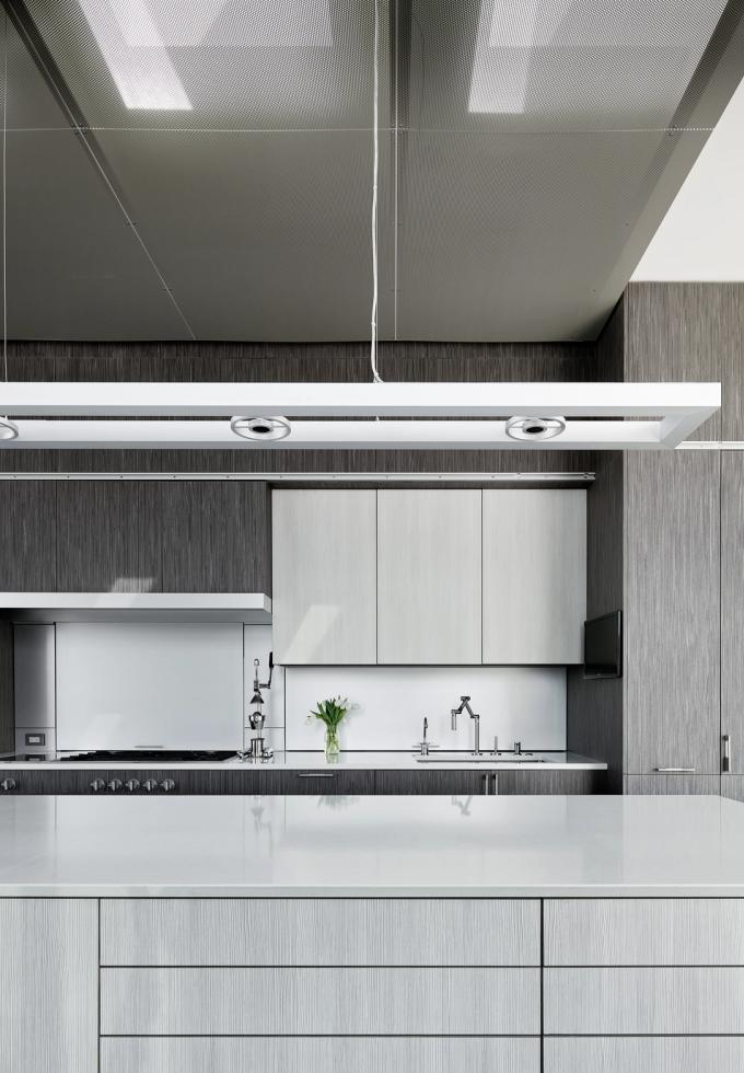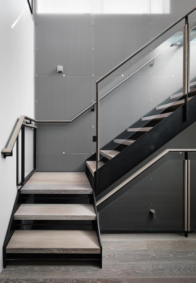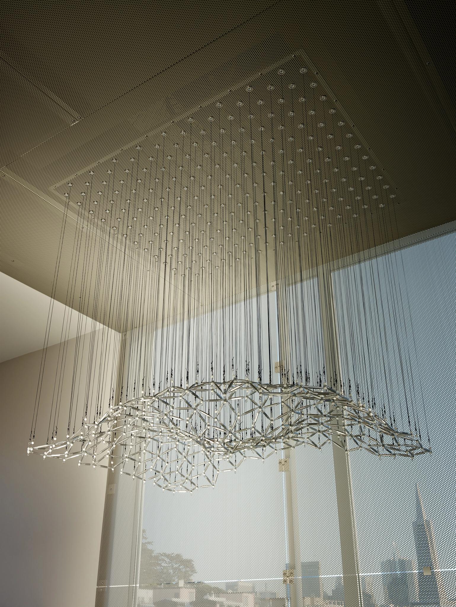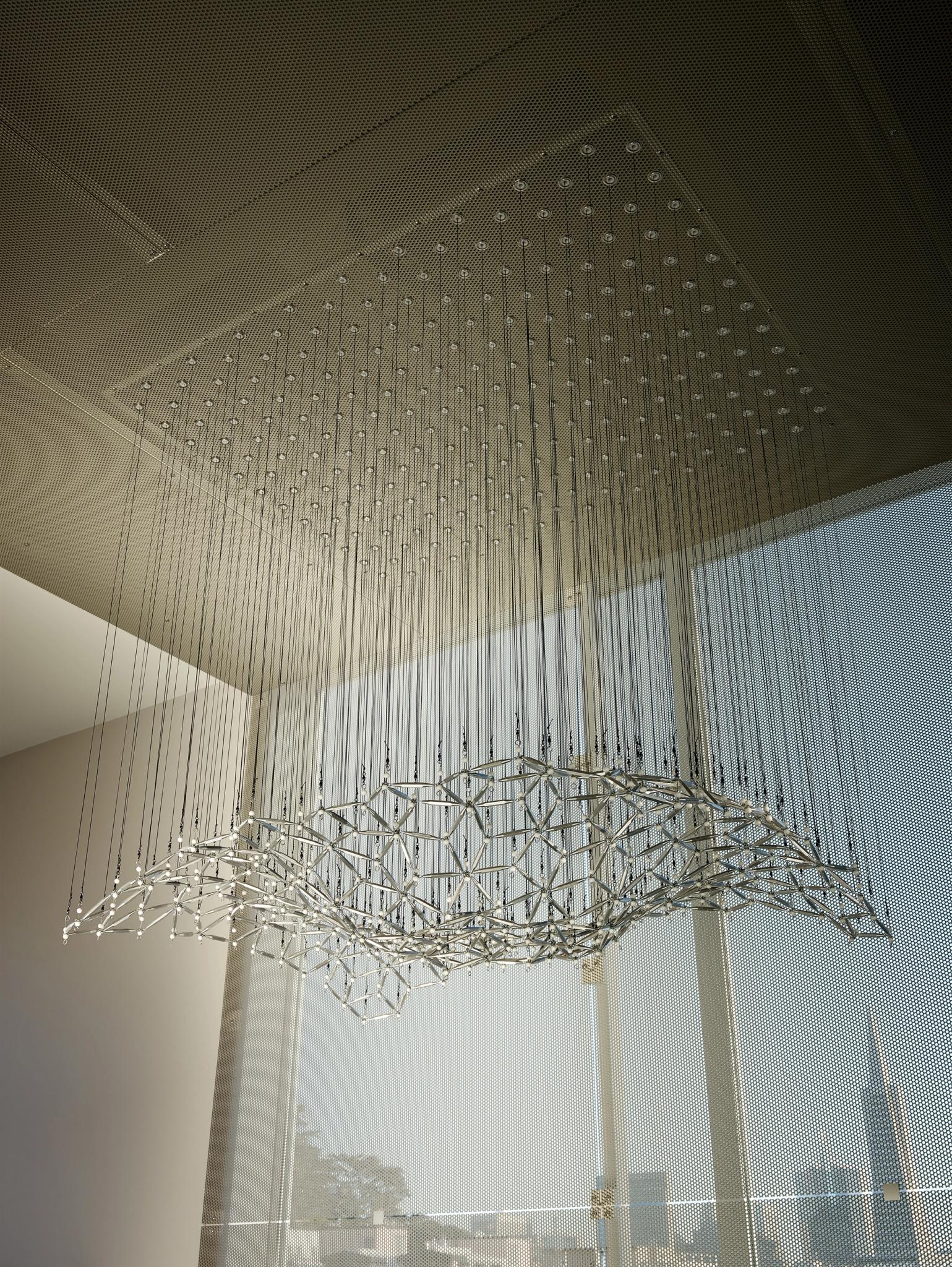 A custom kinetic sculpture by local artist, Reuben Margolin, hangs above the staircase - over one hundred fishing wires were individually fed through the openings of the perforated metal screen and are powered by an armature that introduces a fluid three-dimension wave motion into the piece.