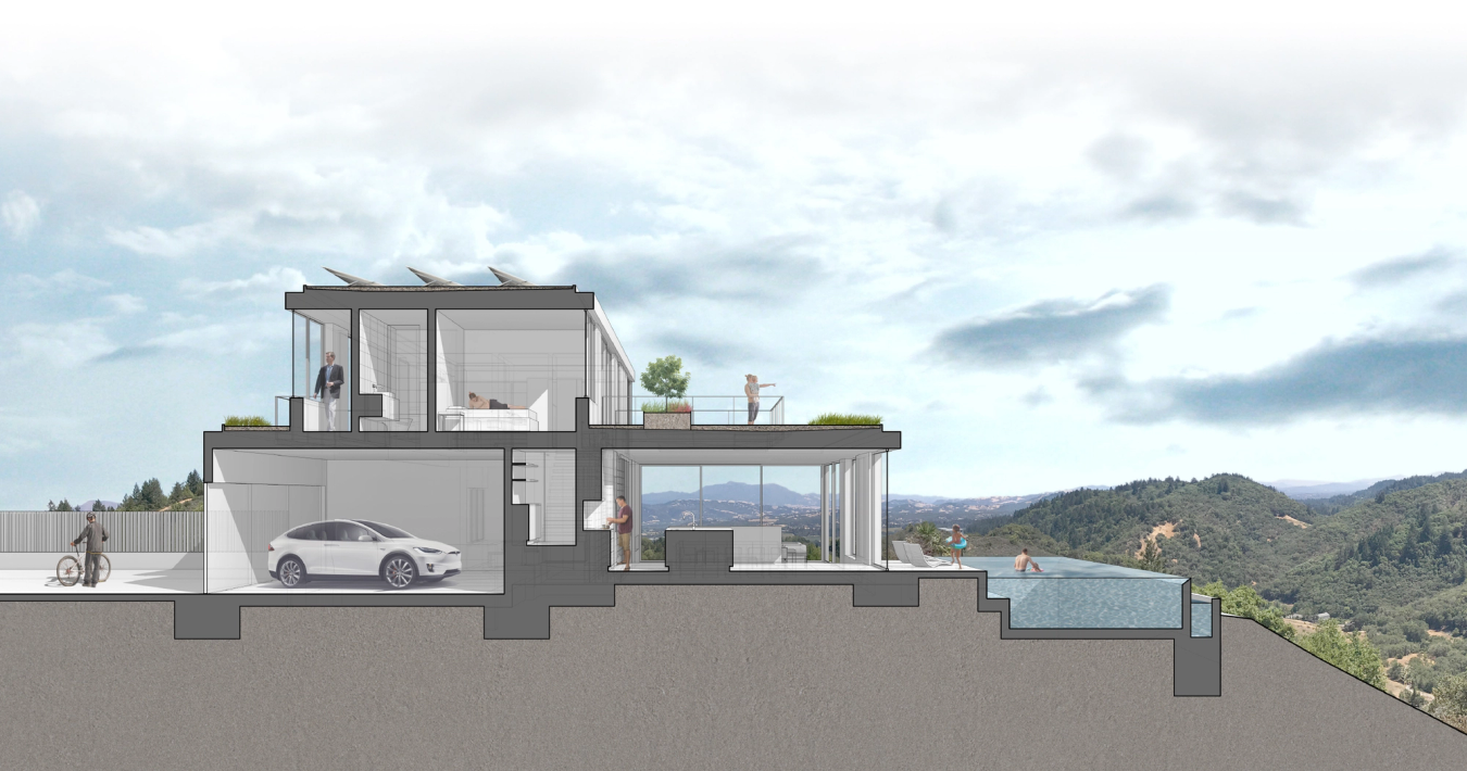 After losing their mountain home to a fire in 2017, our clients were eager to start fresh and improve upon the shortcomings of the original structure. Draped at the top of a ridge in Healdsburg, with views stretching across the valley as far as Mount Saint Helena, the diverse and picturesque site served as a starting place for an imaginative retreat for a forward-thinking family. The Phoenix is a modern home that intimately connects its occupants to the dramatic landscape, thoughtfully framing and prioritizing views, and refreshing a site scarred by California fires.