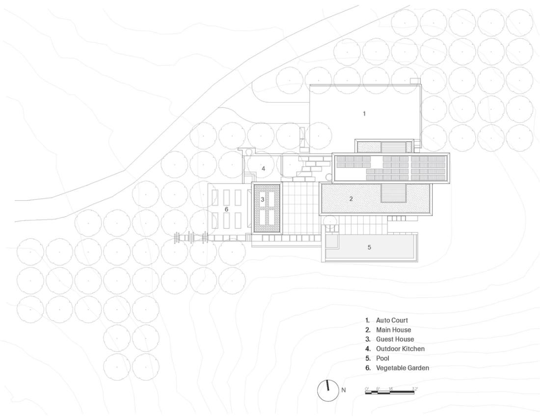The project asked our team to rethink the home’s placement, creatively and sensitively responding to the sloping site. The house and landscape plans are defined by a series of elongated, stacked, rectilinear forms stretching from east to west. The original layout situated the pool significantly downslope of the house, resulting in a disconnect between indoor and outdoor living spaces. Due to the complexities of the steep site, our design team faced the challenging task of relocating the pool to improve its relationship with both the home and the pool house; the resulting design crafts a series of intimate indoor-outdoor spaces for hosting and entertaining, as well as calm moments of immersion in the surrounding landscape.