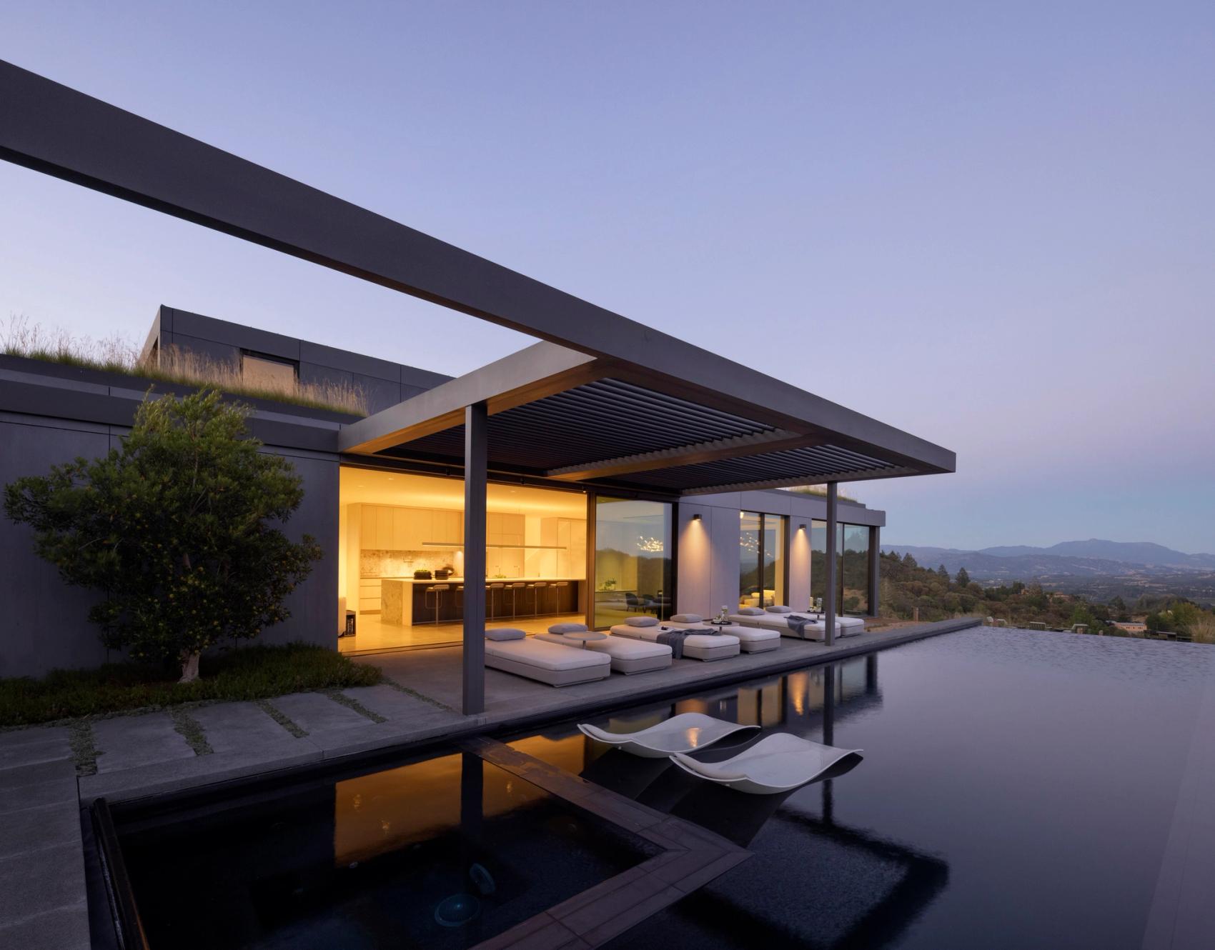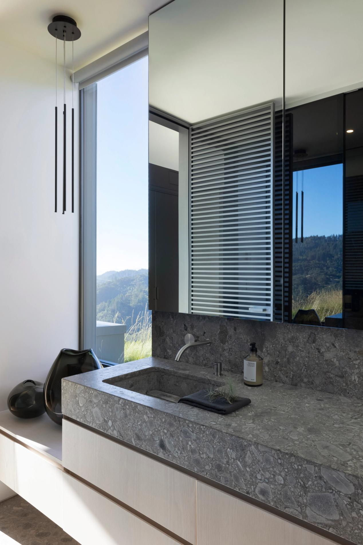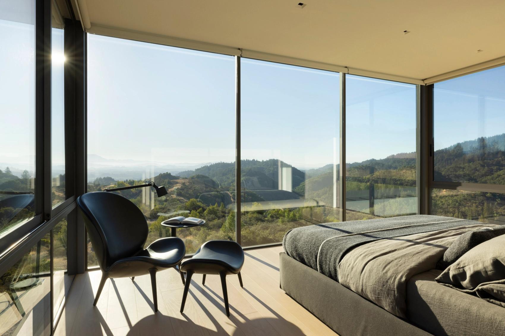On the upper level, the windowed primary suite dramatically floats over valleyed views, sitting lightly above the rolling coastal fog that blankets the Healdsburg hills. Connecting hallways open onto green roofs and a western deck designed to capture colorful mountain sunsets, as well as additional bedrooms perch over tailored lower-level landscape moments. With turnkey interiors by Gaile Guevara Studio, the retreat is fit with products, finishes, and furnishings all sourced from healthy, sustainably-minded brands and suppliers.