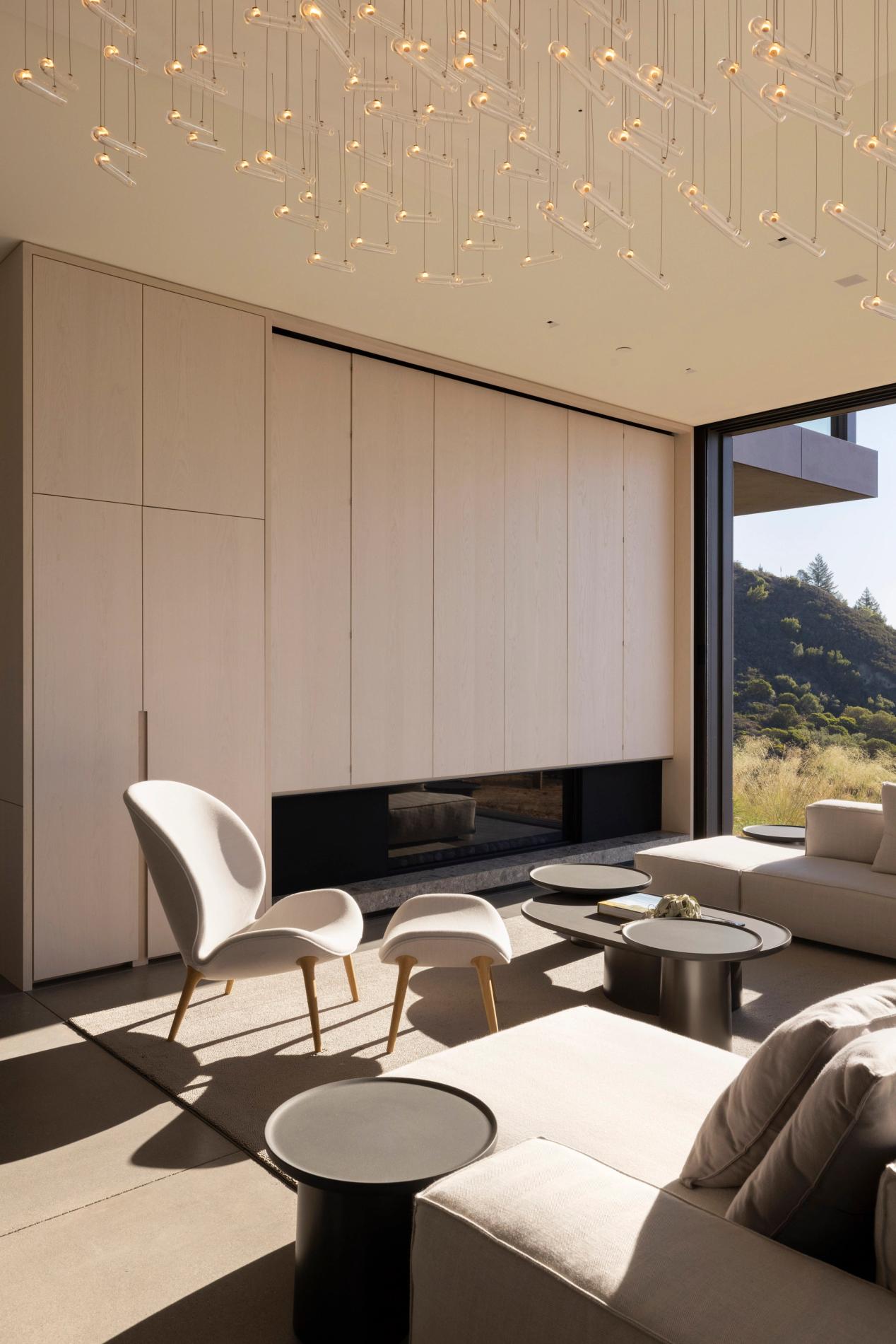 Looking southeast towards sprawling mountain views, an open kitchen and living room are accented by walls of sliding windowed doors and custom casework. A bespoke lighting sculpture artfully crafted alongside studio DRIFT floats delicately between the dining and living spaces, interjecting a sense of lighthearted movement into clean and modern finishes