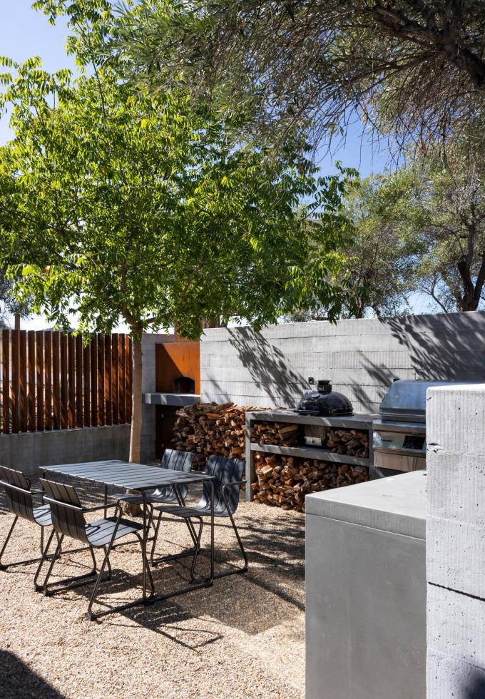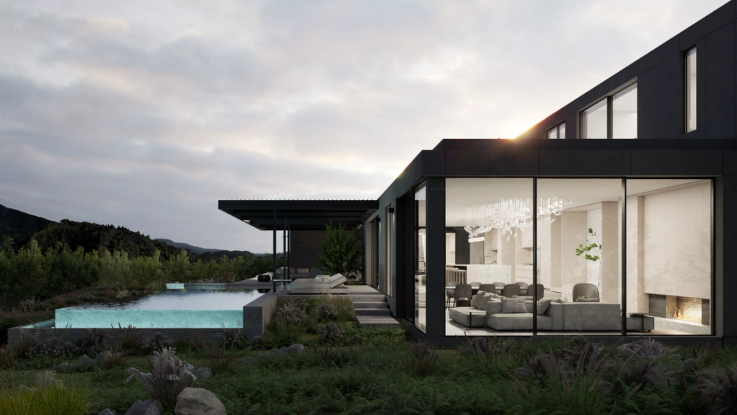 Modern, clean materials and finishes allow sweeping views to speak first. Equitone siding clads the structure, and Blomberg windows open completely onto outdoor living areas. Inside, Cooritalia Grigio Montenapoleano graces the countertops, sinks, and bathrooms, and custom concrete flooring on the first level blurs indoor and out, while engineered European Oak flooring on the second level adds warmth and refinement to private spaces.