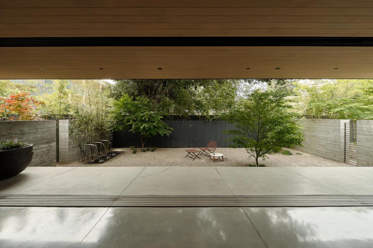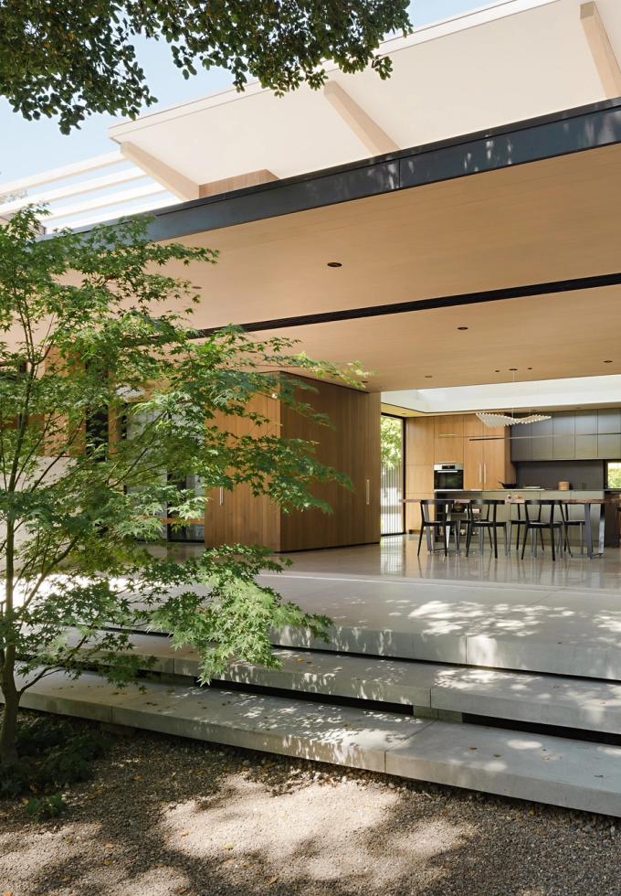 The house is sited quietly behind the large heritage oak tree with its canopy stretching across the generously sized front yard. After passing under its branches, guests are lead through a series of courtyards and view gardens that weave through the undulating footprint of the building. Each interior space is paired with its own landscape moment, allowing the architecture and site to flow into each other.